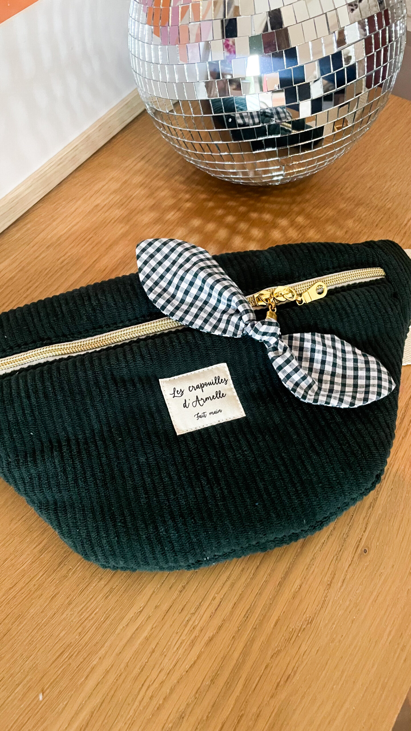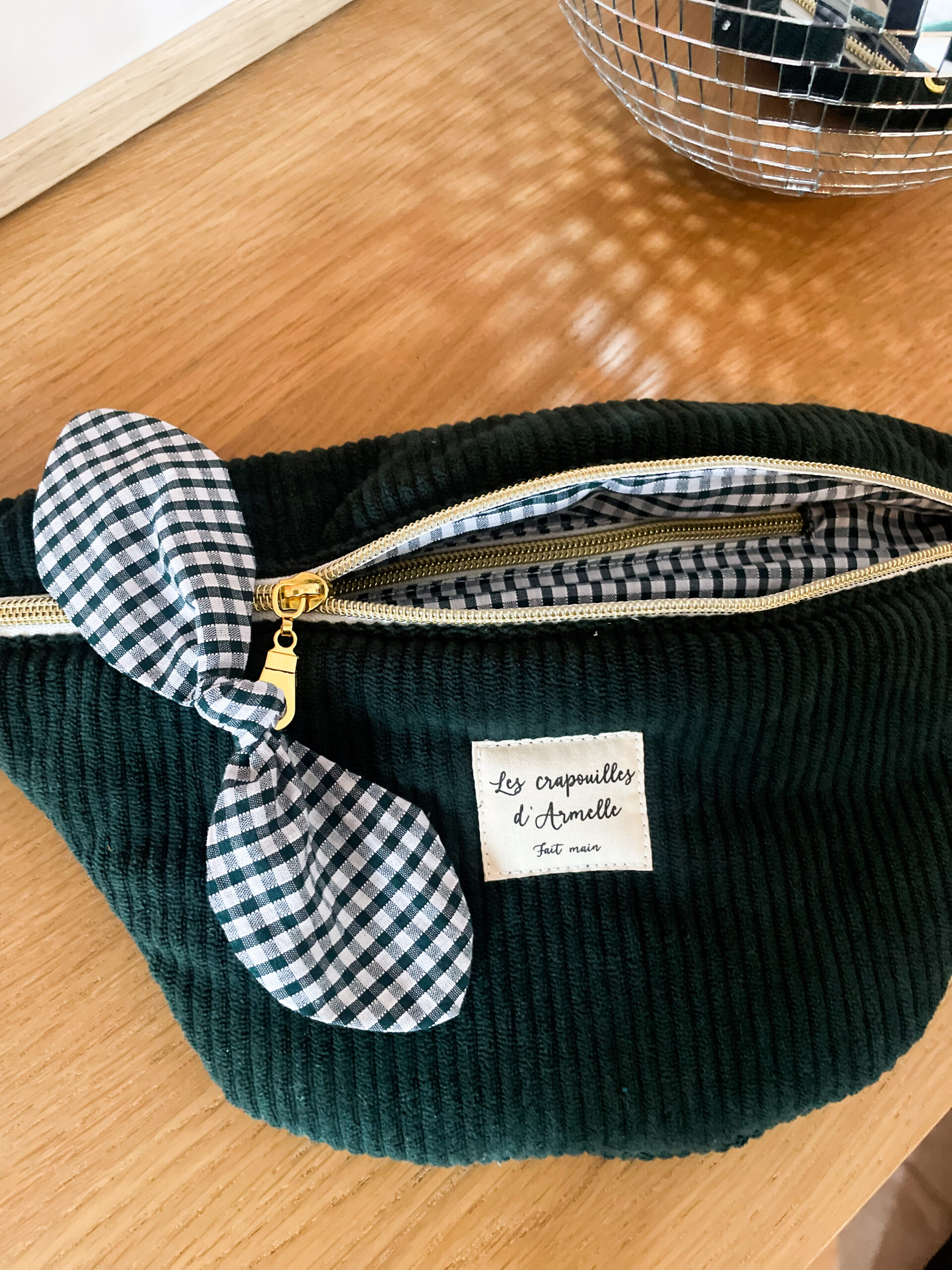 Sac banane en velours vert sapin pour femme, idéale pour démarrer l’automne. Merveilleuse doublure vichy vert