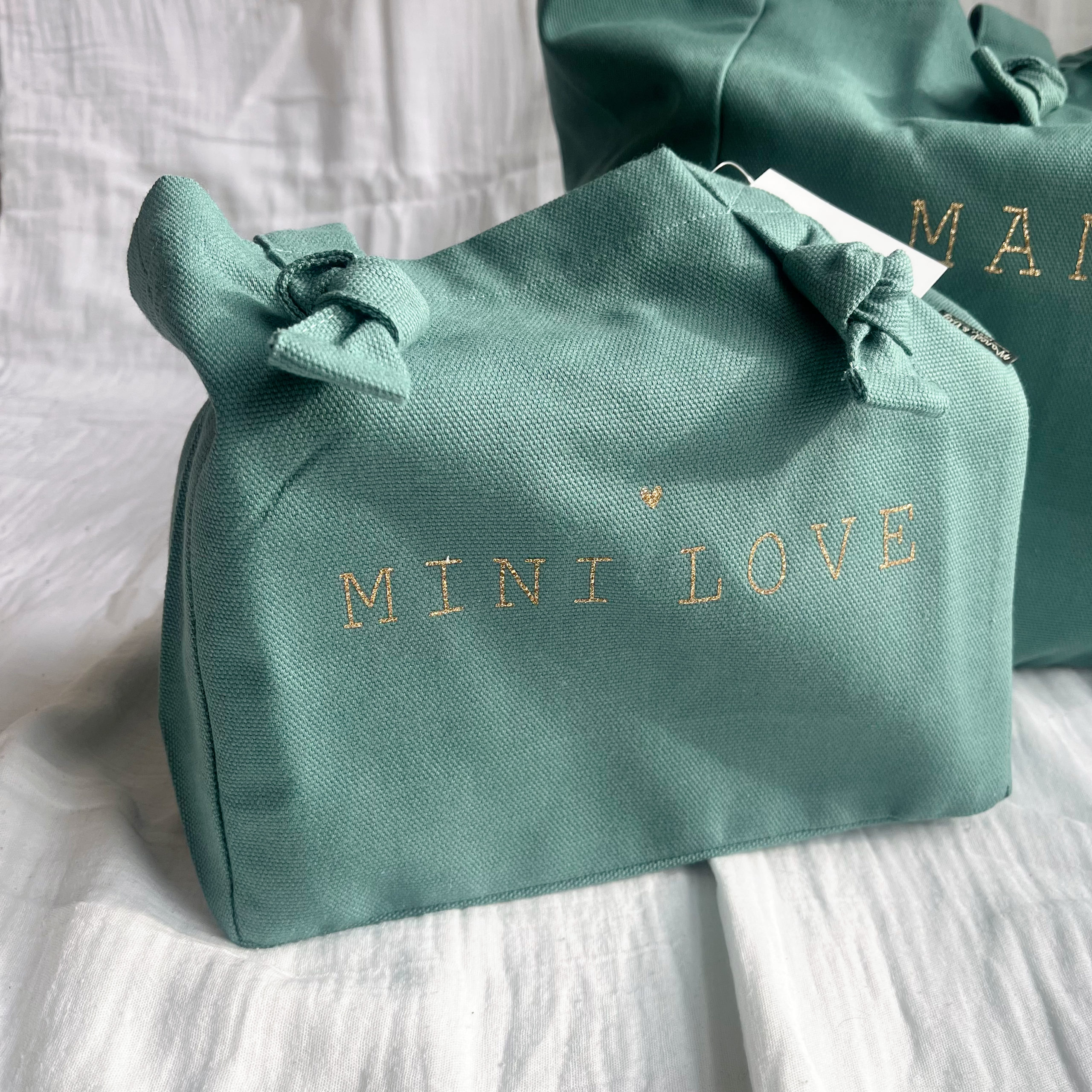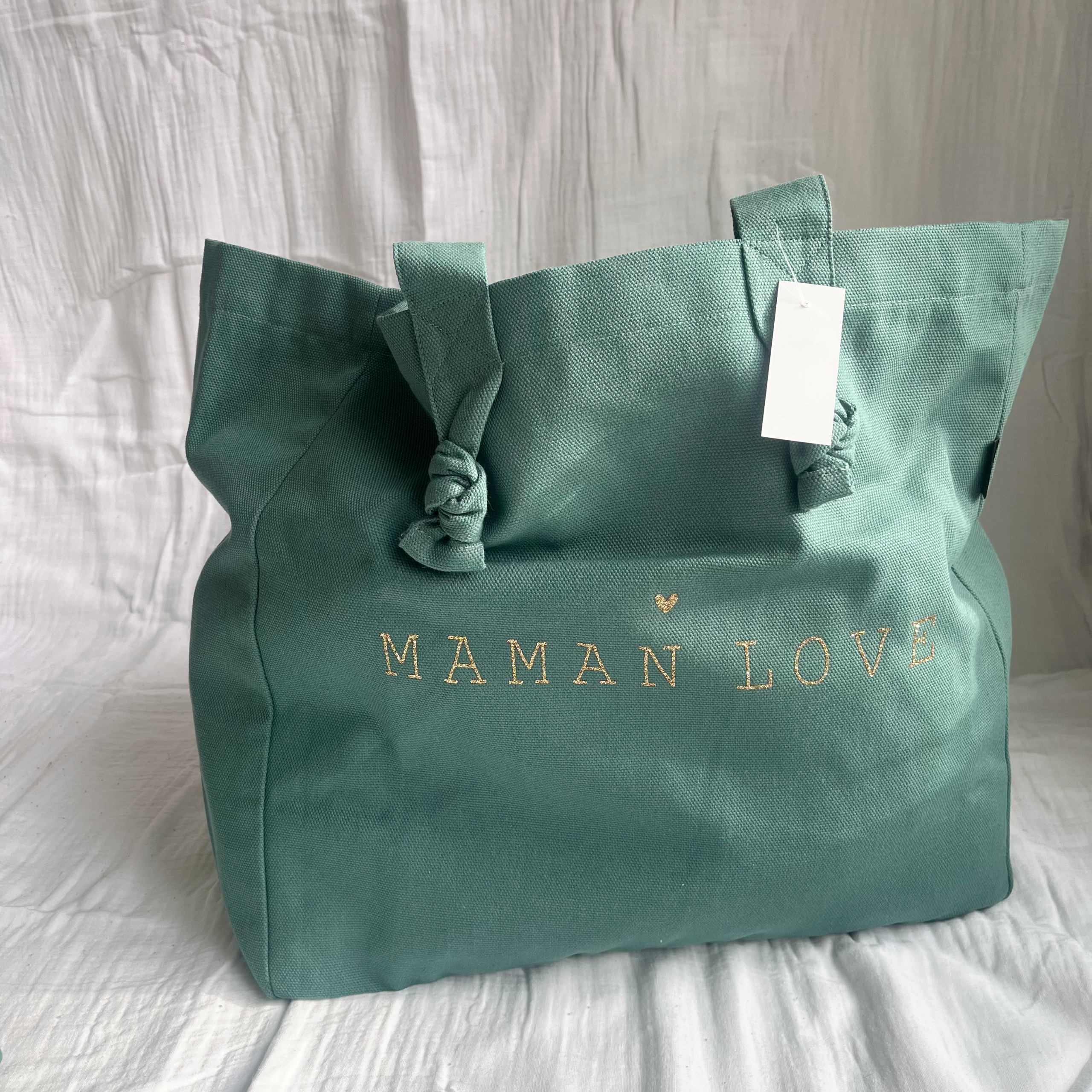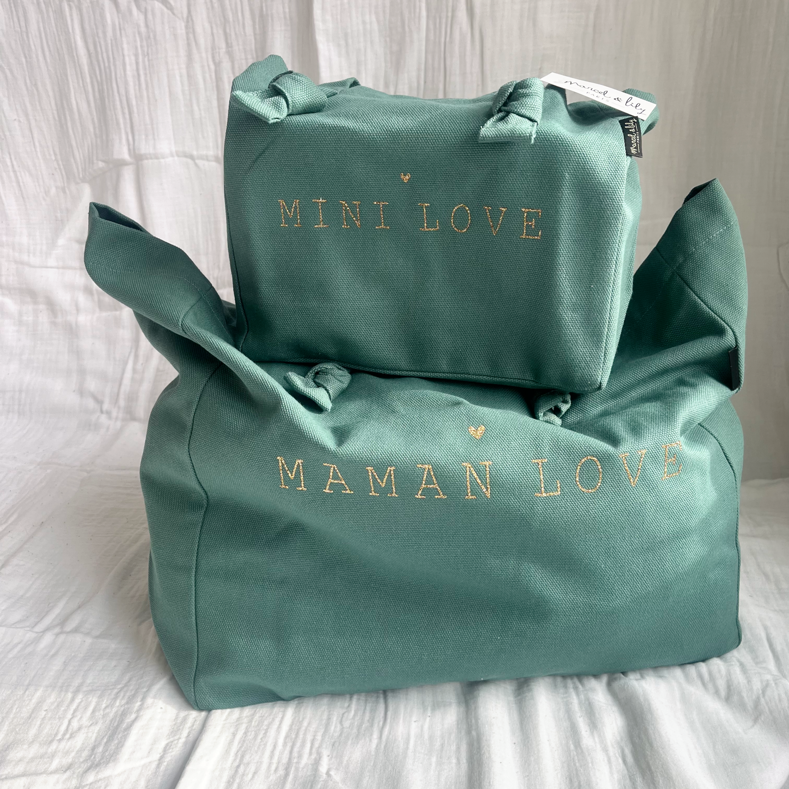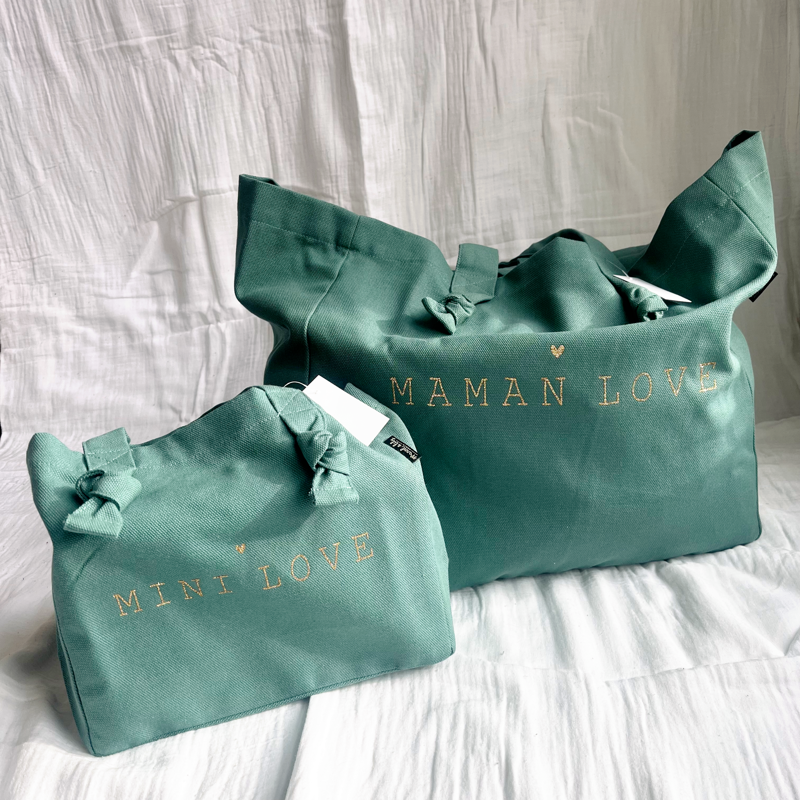 Sac cabas « Maman Love », « Mini Love » pour un duo parfait Grand cabas « Maman Love » avec ses noeuds très mignon, confectionné dans une jolie toile de coton 320 gr certifiée Oeko Tex couleur eucalyptus et son imprimé pailleté or.Cabas 100% coton 320 g/m2Dimensions cabas « Maman Love » : 40 cm de largeur X 37,5 de hauteur cm soufflet 19 cmDimensions cabas « Mini Love » :26 cm de largeur X 25 de hauteur cm soufflet 11 cm