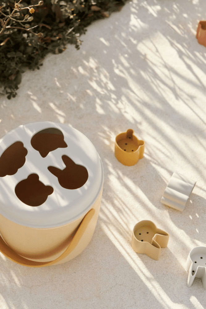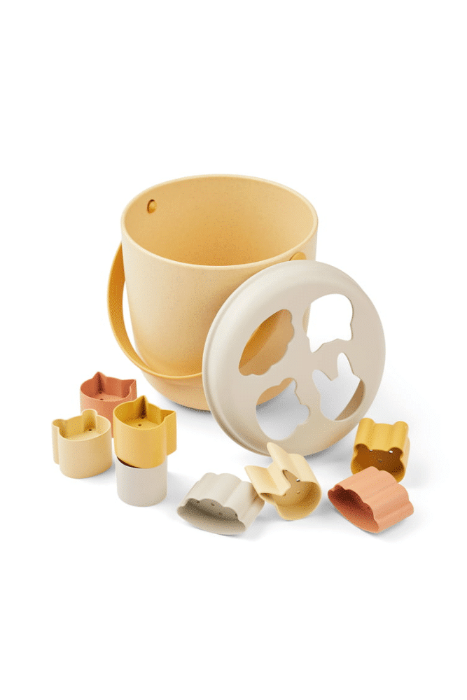 Le seau de plage Liewood avec couvercle et moules en forme d’animaux. Il peut également être utilisé comme boîte à puzzle. Les moules ont des trous, de sorte que l’eau peut s’écouler à travers.