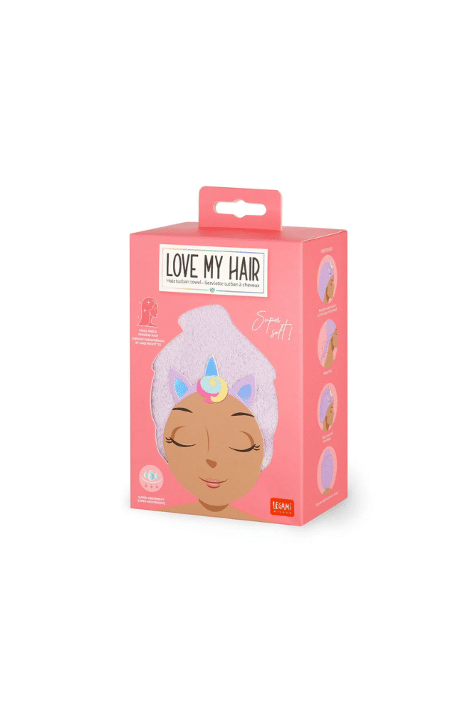 La serviette turban à cheveux Licorne de Legami prend soin de vos cheveux à peine sortis de la douche. Ce doux turban licorne en microfibre super absorbante enveloppe votre chevelure en 4 mouvements simples et se fixe à l’aide d’un simple bouton.