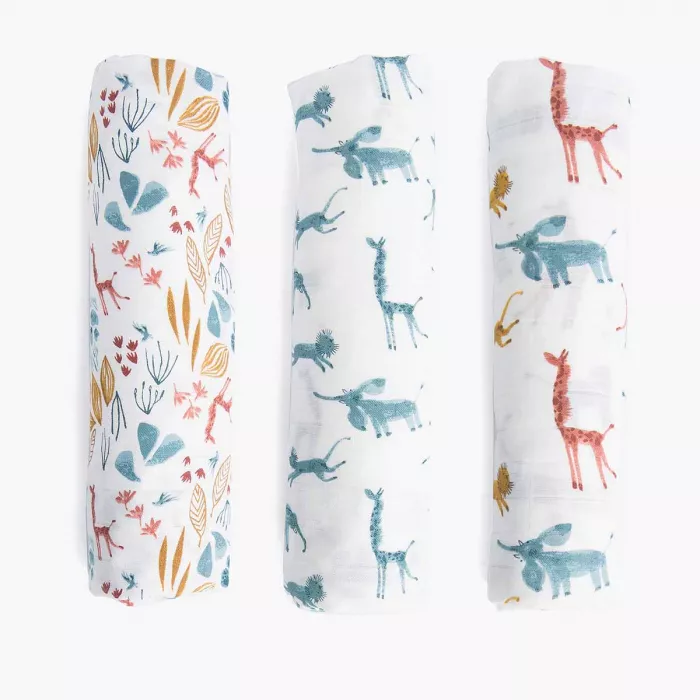 Set de 3 langes imprimes (bleu/girafe/animaux)