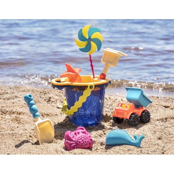 Jouet de plage bleu Petit Jour Paris pour construire des châteaux de sable, creuser des trous, créer des tours et des animaux dans le sable. L’essentiel de l’équipement pour les créateurs en herbe.