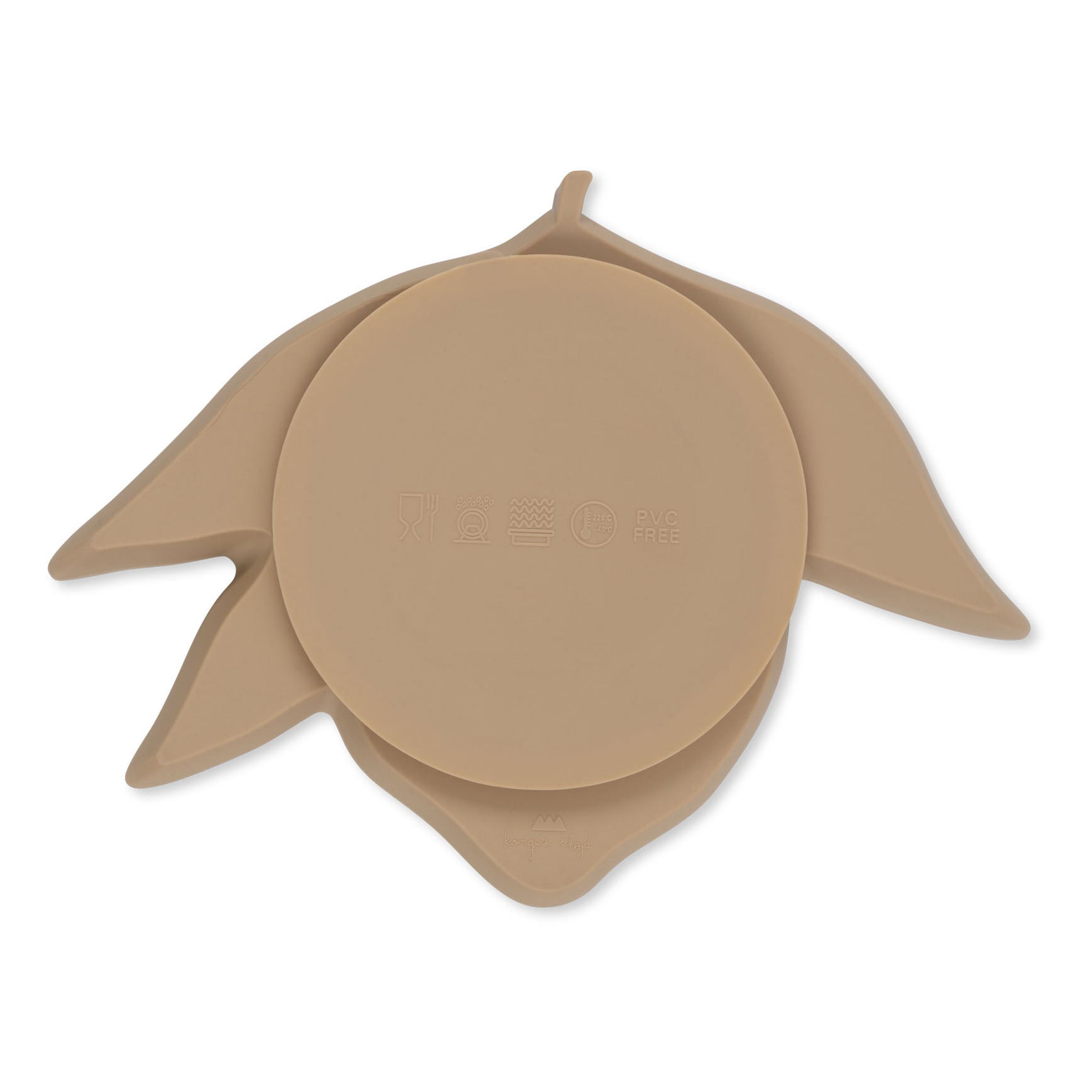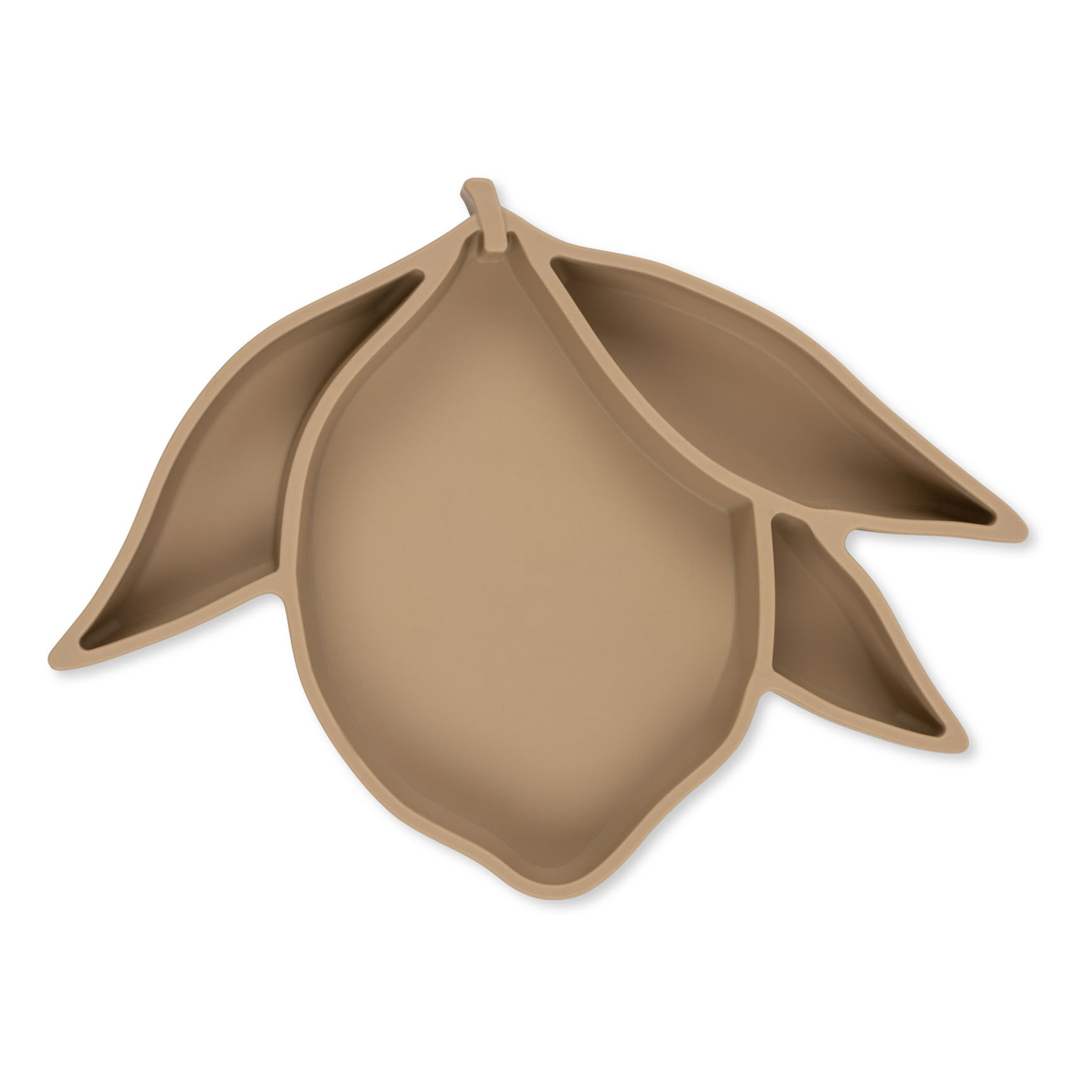 Kit en silicone de la marque Konges Slojd avec leur célébre citron, il est composé : d’une assiette compartimentée à ventouse et d’une tasse à anse imprimée citron.