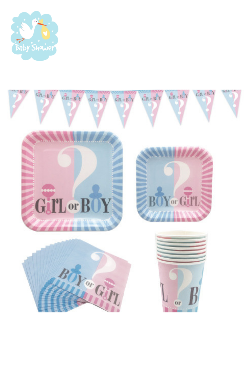 Assortiment assiettes, serviettes, gobelets et fanions pour votre fête baby shower. Idéal pour révéler le sexe de bébé à vos invités et vos proches.