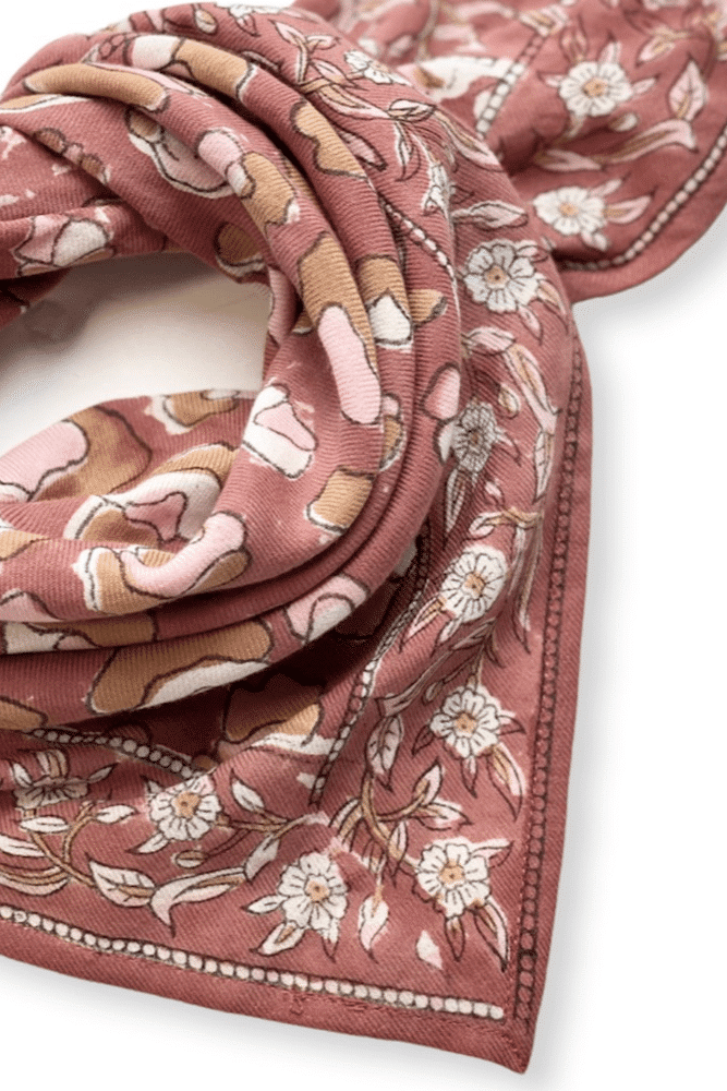 Le joli foulard qui s’assorde à tous les styles. Sa fabrication artisanale grâce à la technique du block-print le rend unique. Vous pouvez oser le matchy matchy avec votre enfant. Le grand modèle (100 x 100 cm) disponible en cliquant ici.