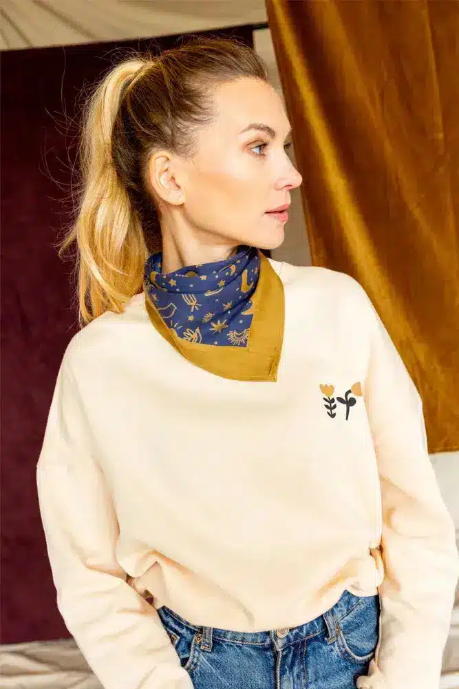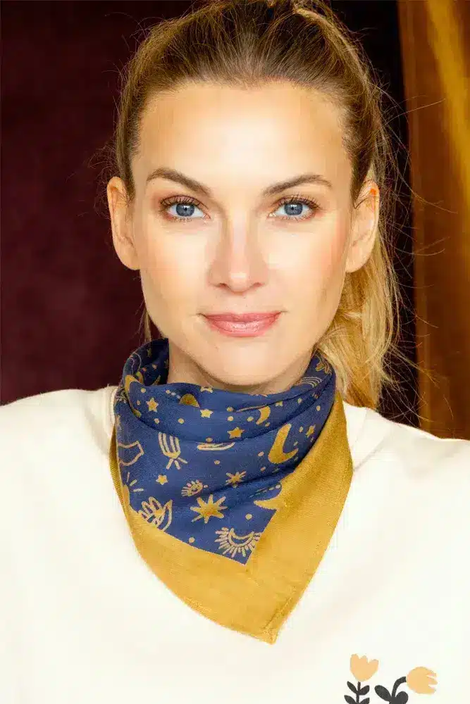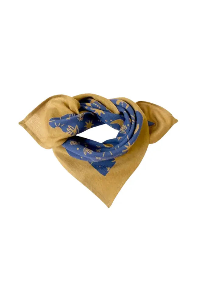 Découvrez le joli foulard en petit format avec son imprimé Karma de la marque Apaches Collection. Imprimé selon la méthode du block-print.