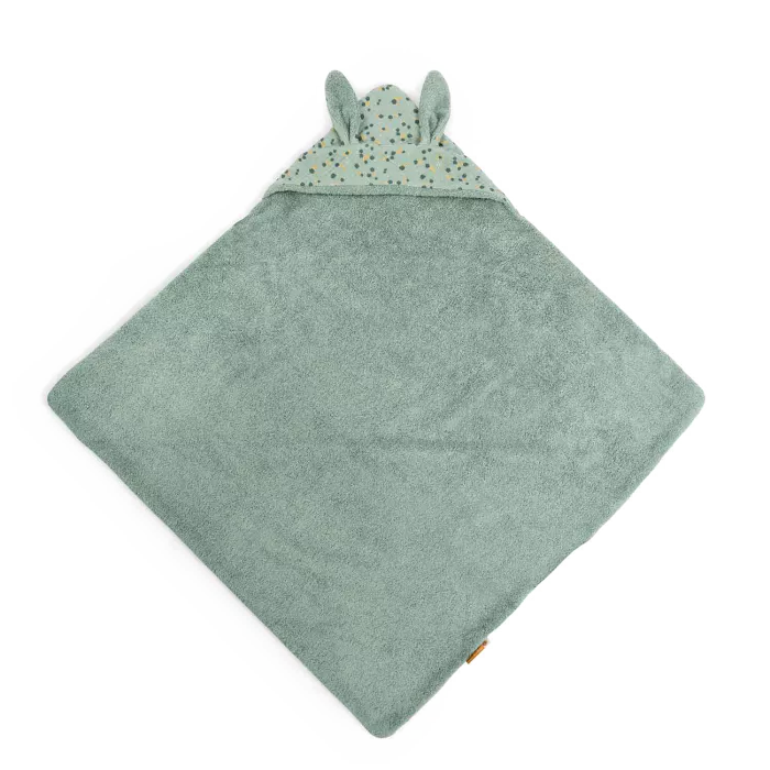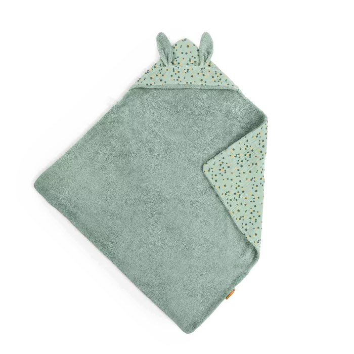 Cape de sortie de bain sauge 100% coton en lange et éponge bouclette, certifiée OEKO-TEX®, avec une capuche en tête de lapin pour accueillir chaudement bébé à la sortie du bain. Peut être brodé au prénom de l’enfant.
