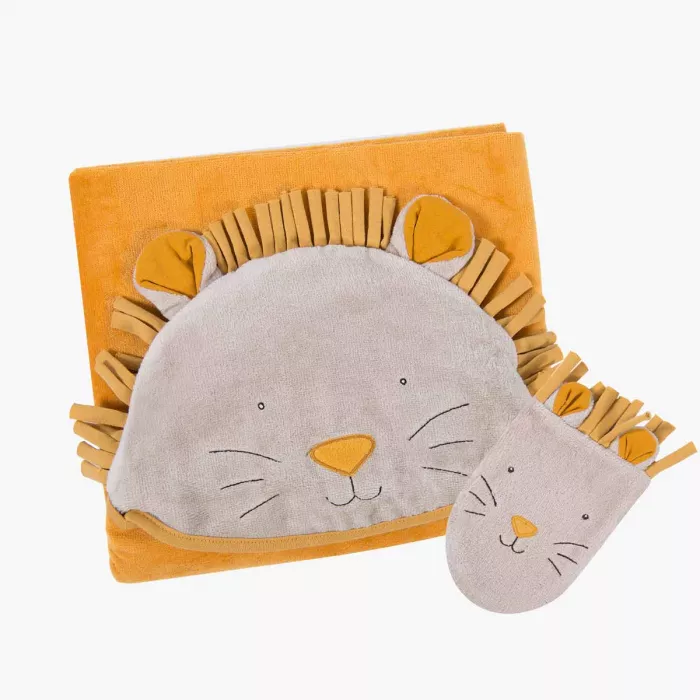 Cape de bain en éponge avec une capuche en tête de lion et sa drôle de crinière… que l’on retrouve aussi sur un petit gant brodé ! Idéale pour un cadeau de naissance, elle peut être brodée au prénom de l’enfant.
