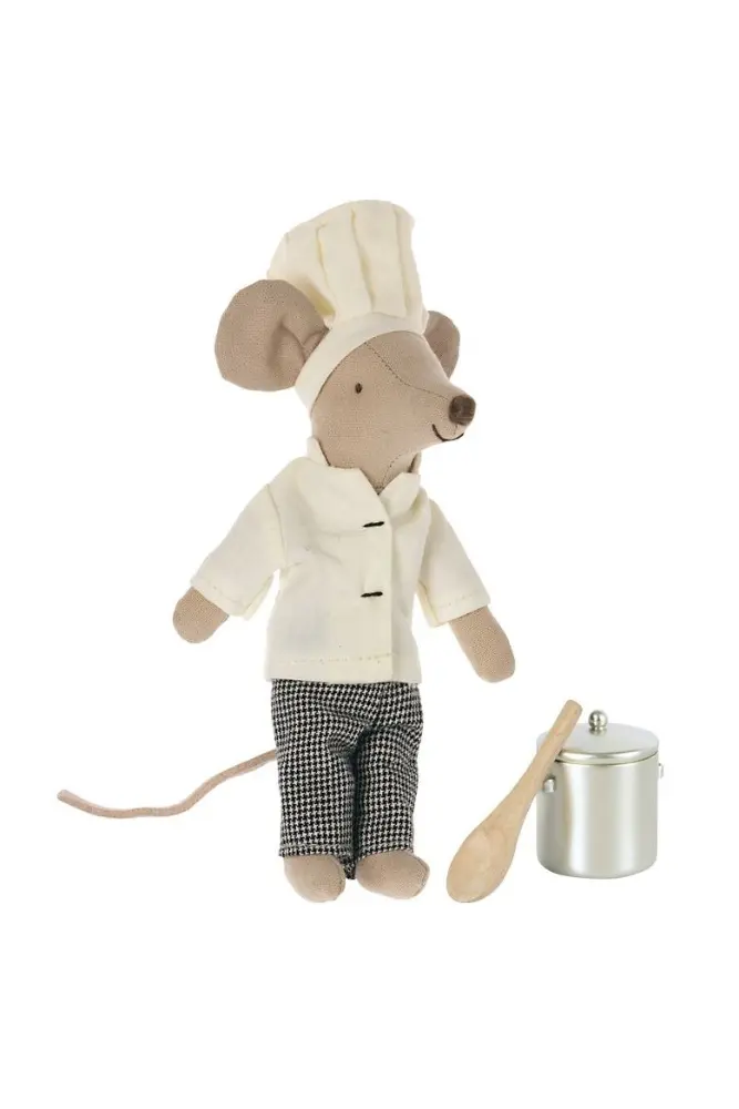 La souris chef Maileg habillée de sa tenue de cuisinier, elle est livrée avec sa casserole et une cuillère en bois.