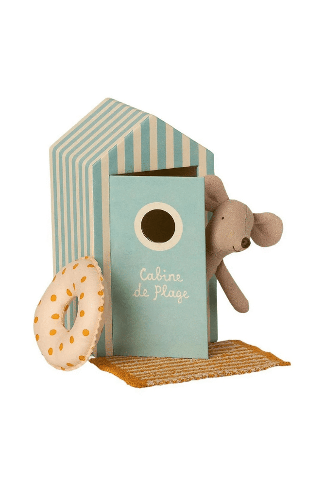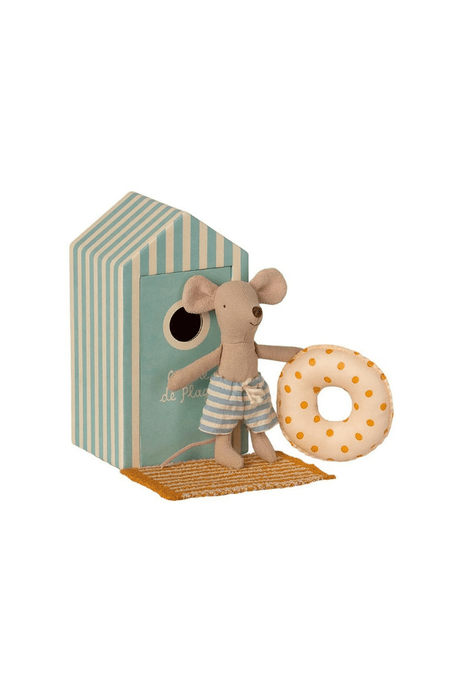 Le temps des vacances ! Cette souris est prête pour une journée à la plage, avec tous les accessoires nécessaires et une belle maison de plage rayée. Comme il est le plus petit membre de la famille, il a bien sûr un flotteur pour le garder en sécurité.