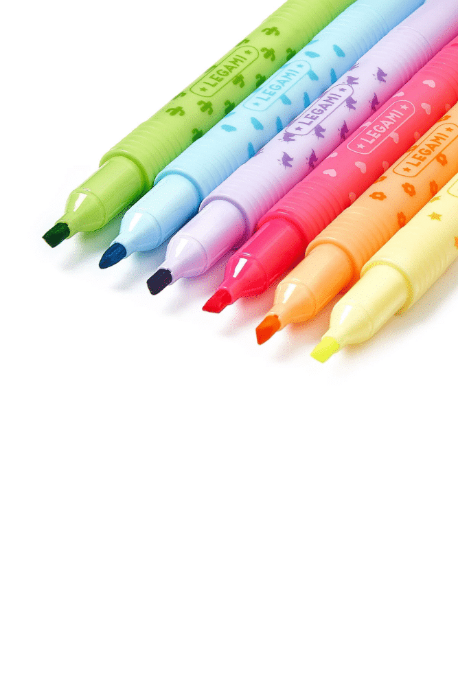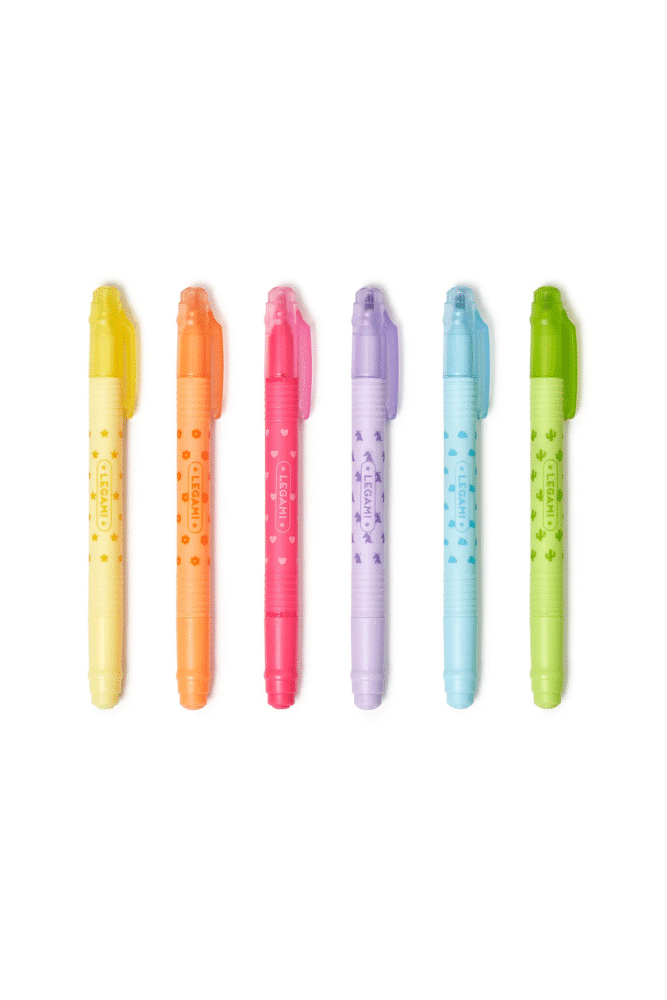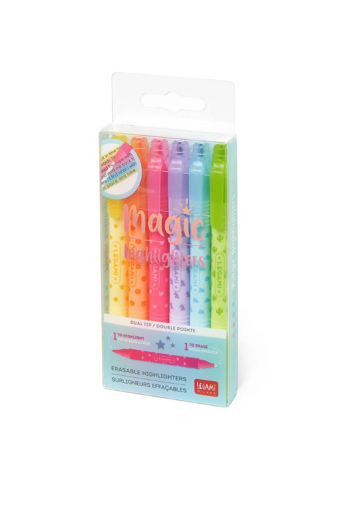 Gardez à portée de main le Set de 6 surligneurs effaçables – Magic Highlighters de Legami ! Chaque feutre dispose d’une double pointe. Vous pouvez utiliser une pointe pour souligner et surligner, lorsque vous changez d’idée il vous suffit de retourner le feutre et d’utiliser l’autre pointe pour effacer.