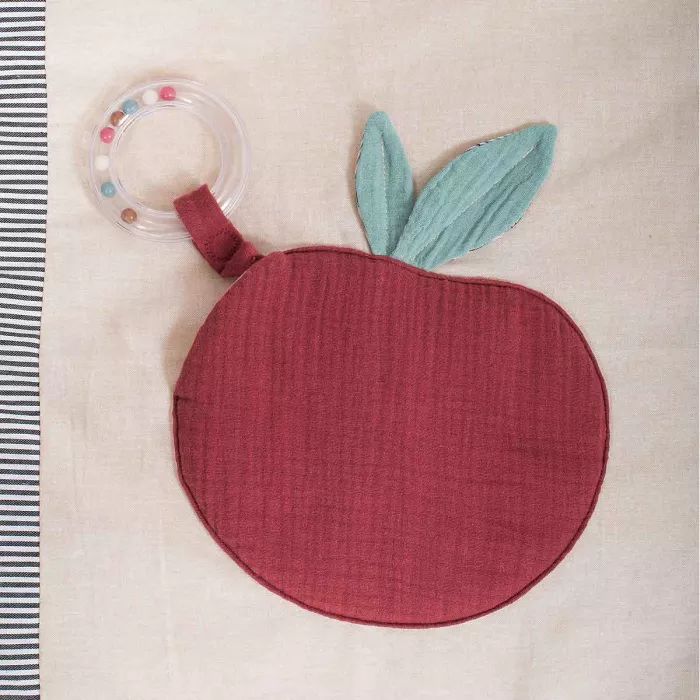 Tapis molletonné en tissu chambray avec de nombreuses activités aux couleurs d’automne. Des feuilles qui font scritch-scritch, un lapin à grelot dans sa tasse de thé, un anneau à billes caché dans la pomme et plein de matières à découvrir avec la météo !