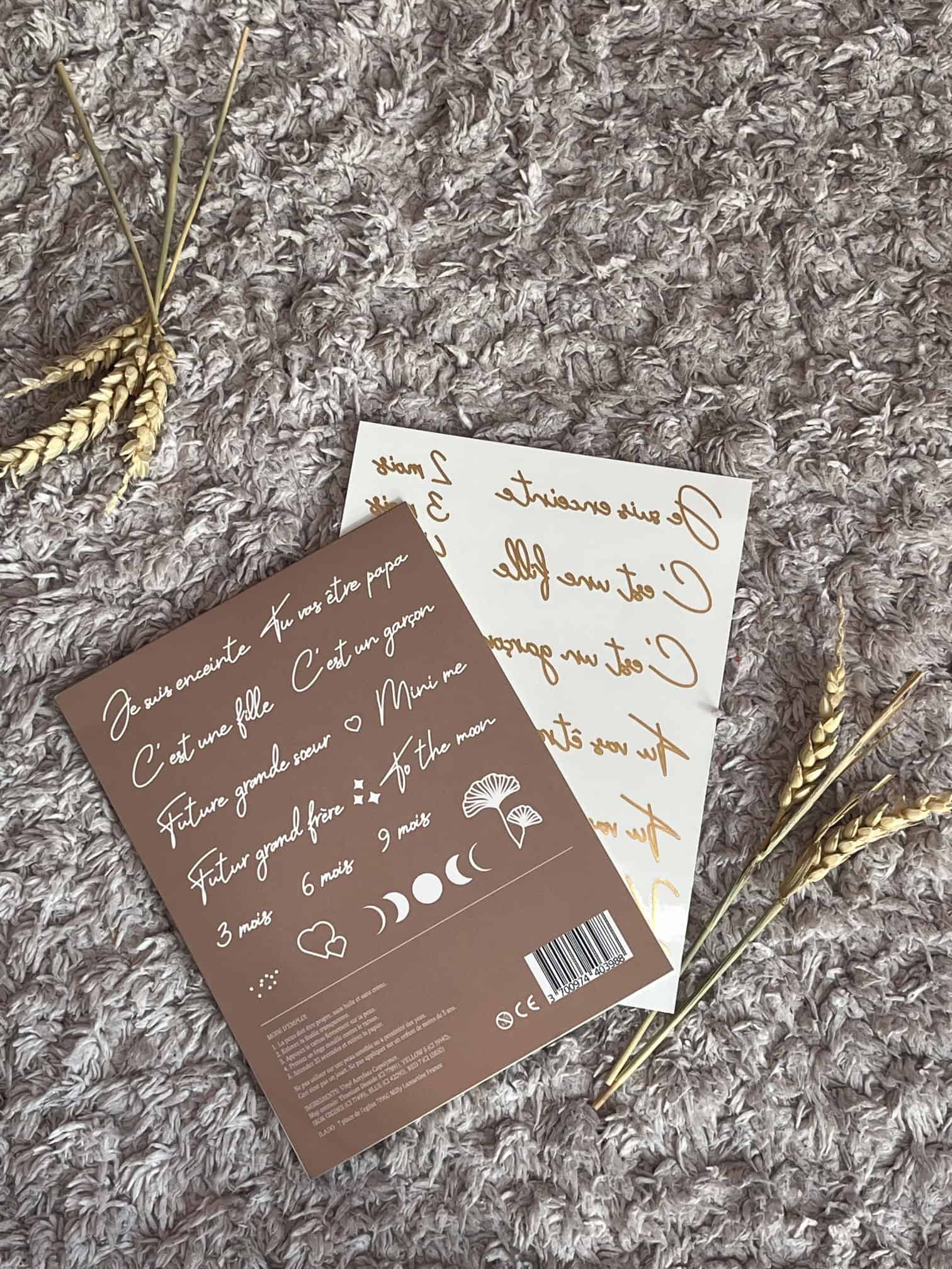 Annoncez votre grossesse avec style grâce à ces tatouages éphémères dorés d’Ilado, parfaits pour des séances photo ludiques en famille. Fabriqués en France et adaptés aux peaux sensibles