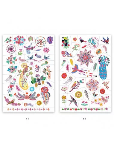 Deux planches de tatouages temporaires sur le thème des oiseaux. Des illustrations raffinées pleines de détails et de poésie, parsemées d’enluminures métallisées roses pour magnifier leur plumage. Faciles à utiliser, ces tatouages temporaires sont prédécoupés et s’appliquent avec un peu d’eau.