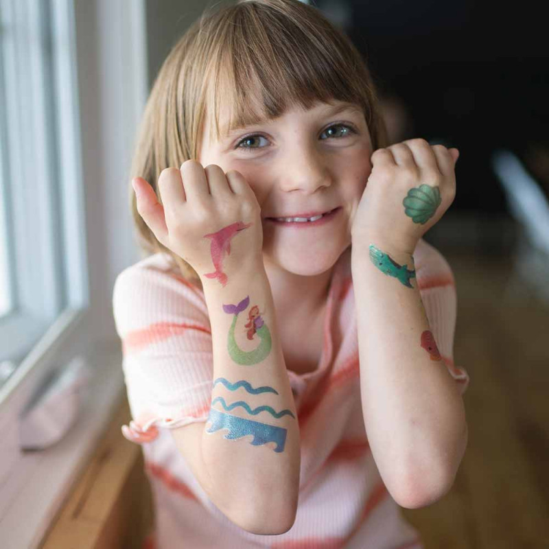 Pochettes de tatouages éphémère sur le thème des Sirènes! Cet ensemble de tatouages comprend des chauves-souris, des araignées et des emblèmes de super-héros fabriqués avec un fini pailleté pour refléter magnifiquement sur la peau!