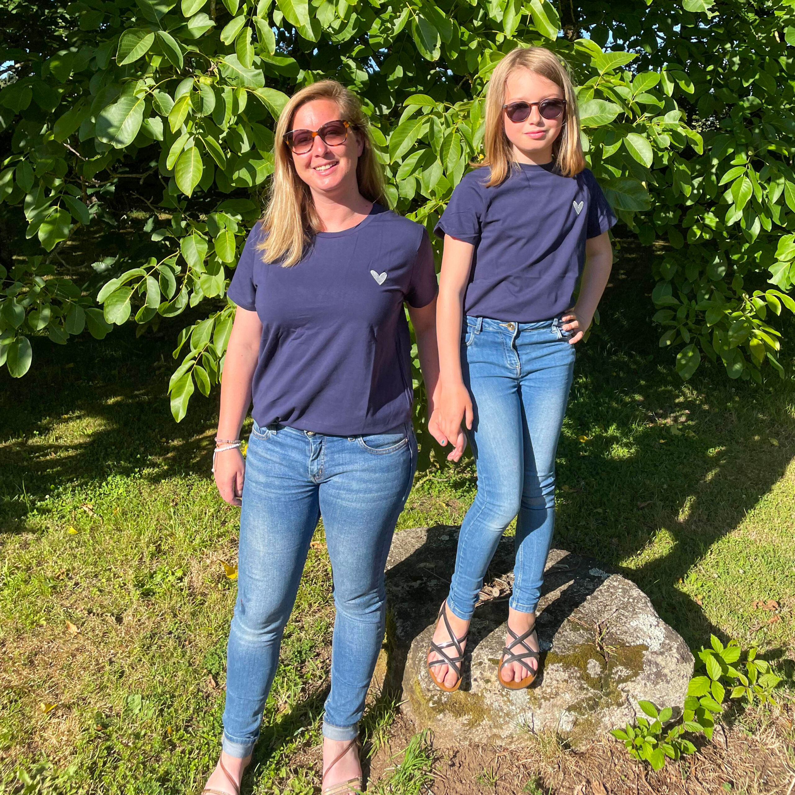 Tee-shirt couleur bleu marine, col rond avec coeur brodé à manches courtes. À partir de 8 ans jusqu’au 16 ans pour les enfants, du S au XL pour les femmes. Prévoir sa taille habituel. Composition : 100% coton
