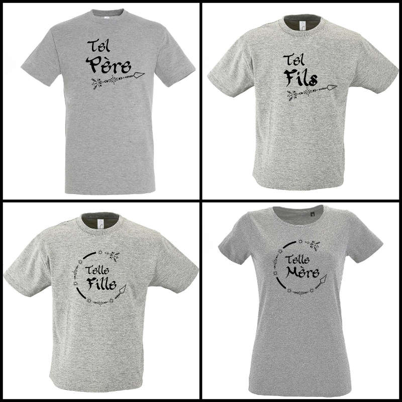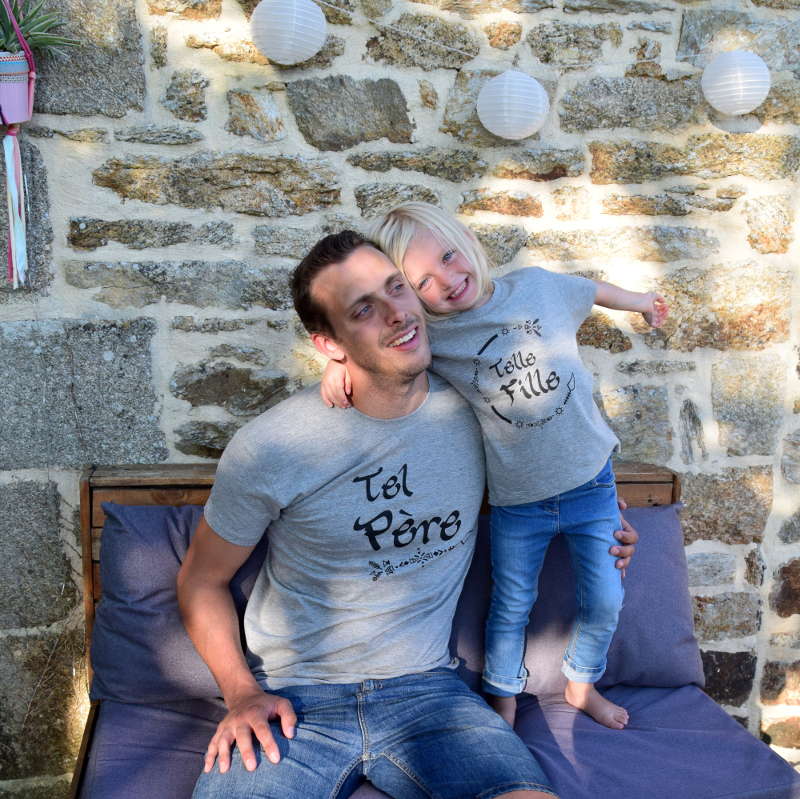 Telle mère telle fille, tel père tel fils, telle mère tel fils ou encore tel père telle fille! Tee-shirt homme, femme, enfant : 85% coton et 15% viscose. Tee-shirt bébé : 85% coton biologique certifié et 15% polyester. Taille bébé : 0/6 mois=60-66cm, 6/12 mois=66-76cm et 12/24 mois=76-86cm. Conseil : les tee-shirts homme, femme et enfant taille un peu plus grand.