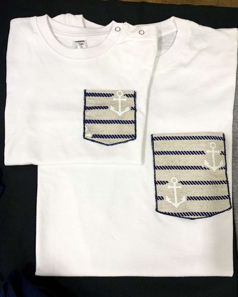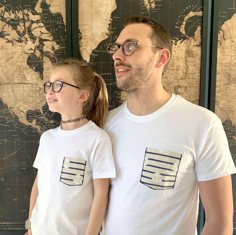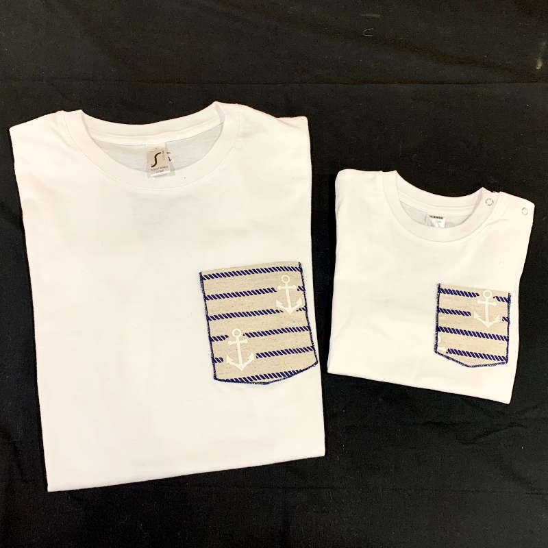 Un look Marin en famille. FAIT MAIN Tee-shirt manches courtes et col rond avec poche motif Ancre. Du 3 mois au 24 mois pour les bébés avec 3 pressions au niveau du col. Du 2 ans et 12 ans pour les enfants. Du S au XL pour femme. Du S au XXL pour homme. composition :100% coton