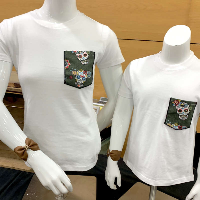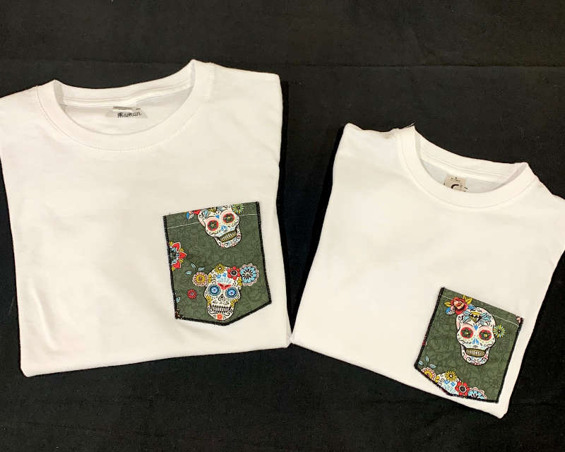 Un look Mexicano en famille. FAIT MAIN Tee-shirt manches courtes et col rond avec poche motif tête de mort. Du 3 mois au 24 mois pour les bébés avec 3 pressions au niveau du col. Du 2 ans et 12 ans pour les enfants. Du S au XXL pour femme. Du S au 3XL pour homme. composition : 100% coton