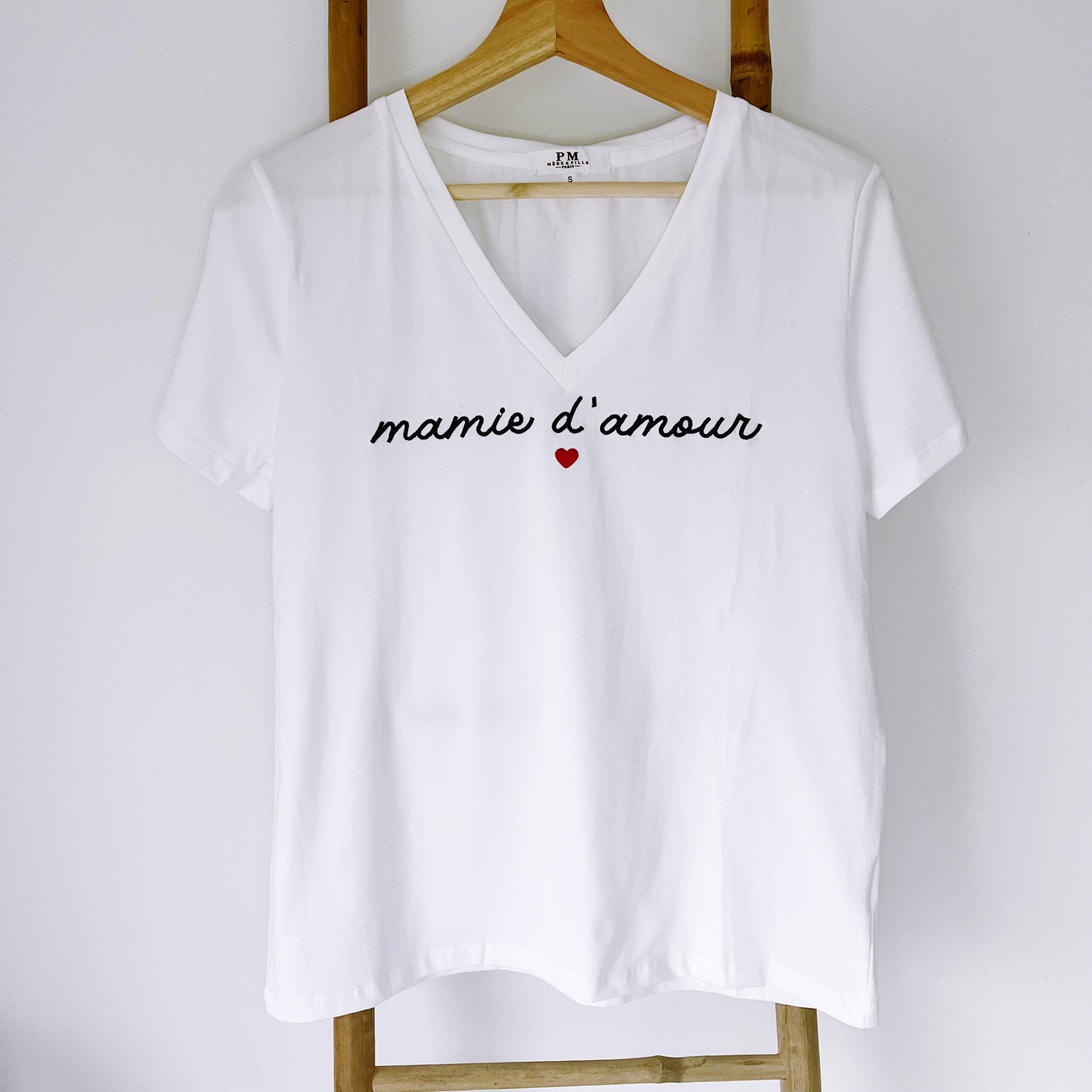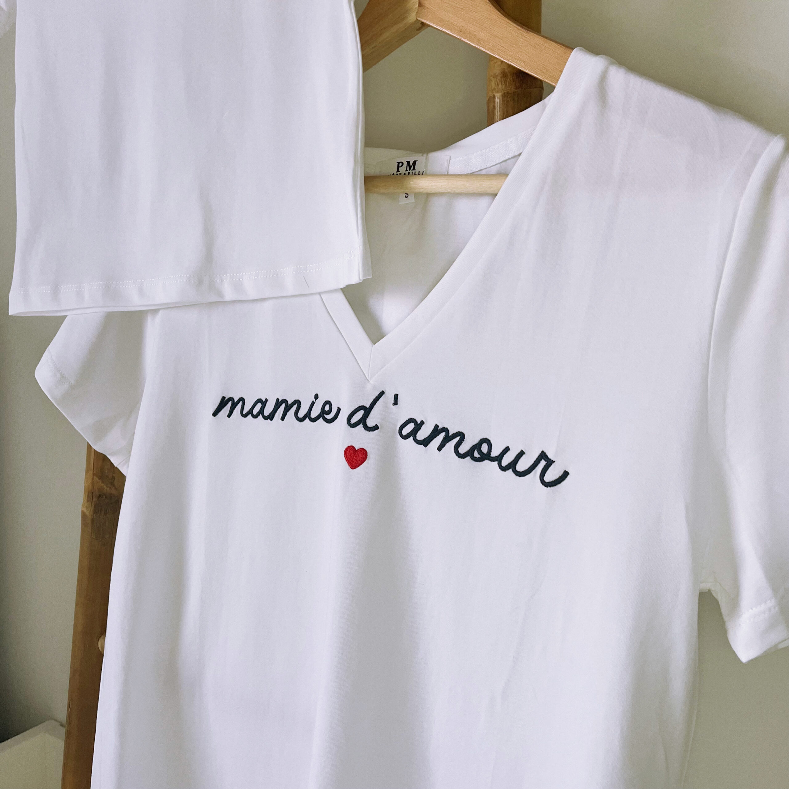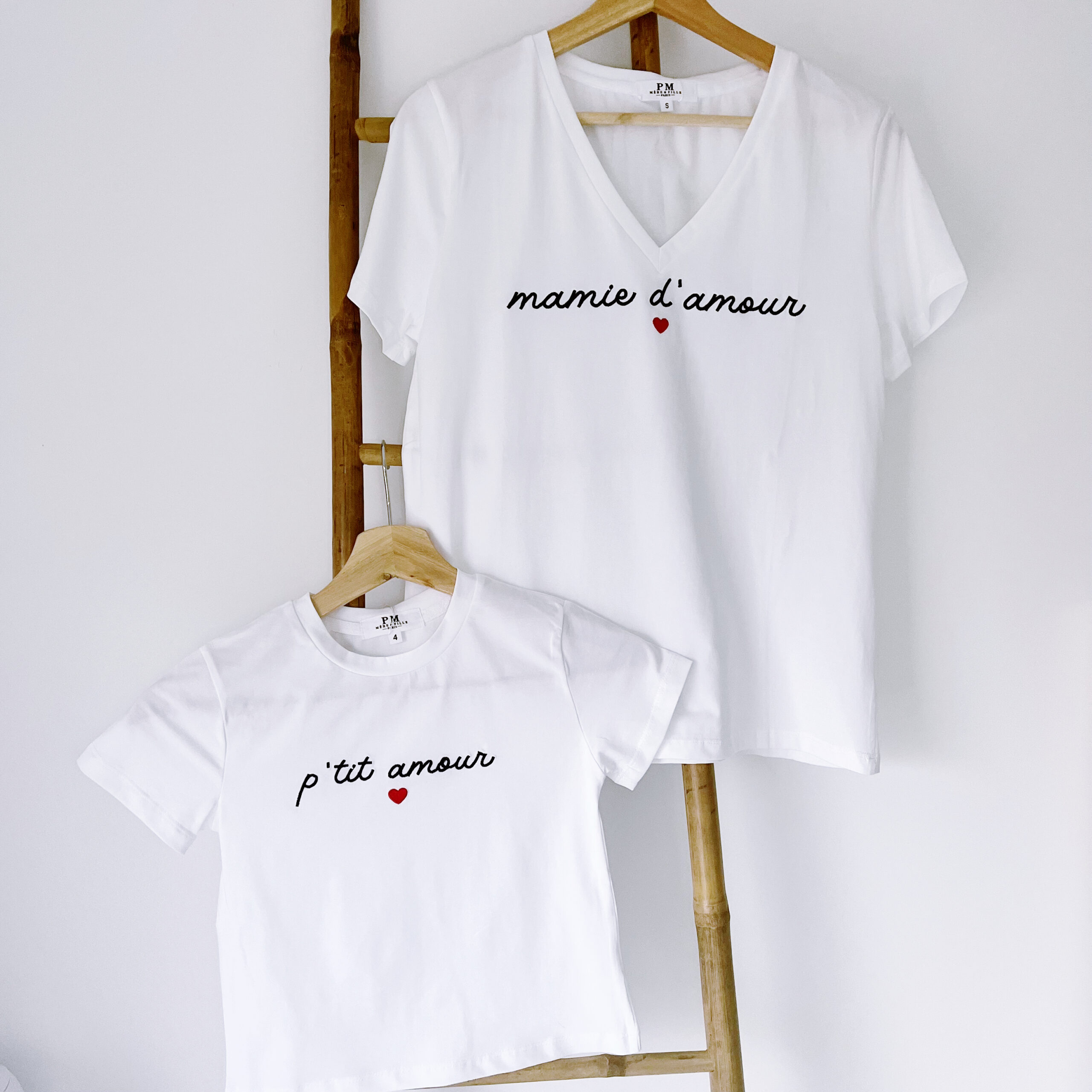 Exactement ce que vous recherchiez ! Un tee-shirt blanc avec des textes brodés. Maman ou Mamie et Enfant assorti, idéal pour se démarquer des autres quand on a une « mamie d’amour » et une « maman d’amour ».