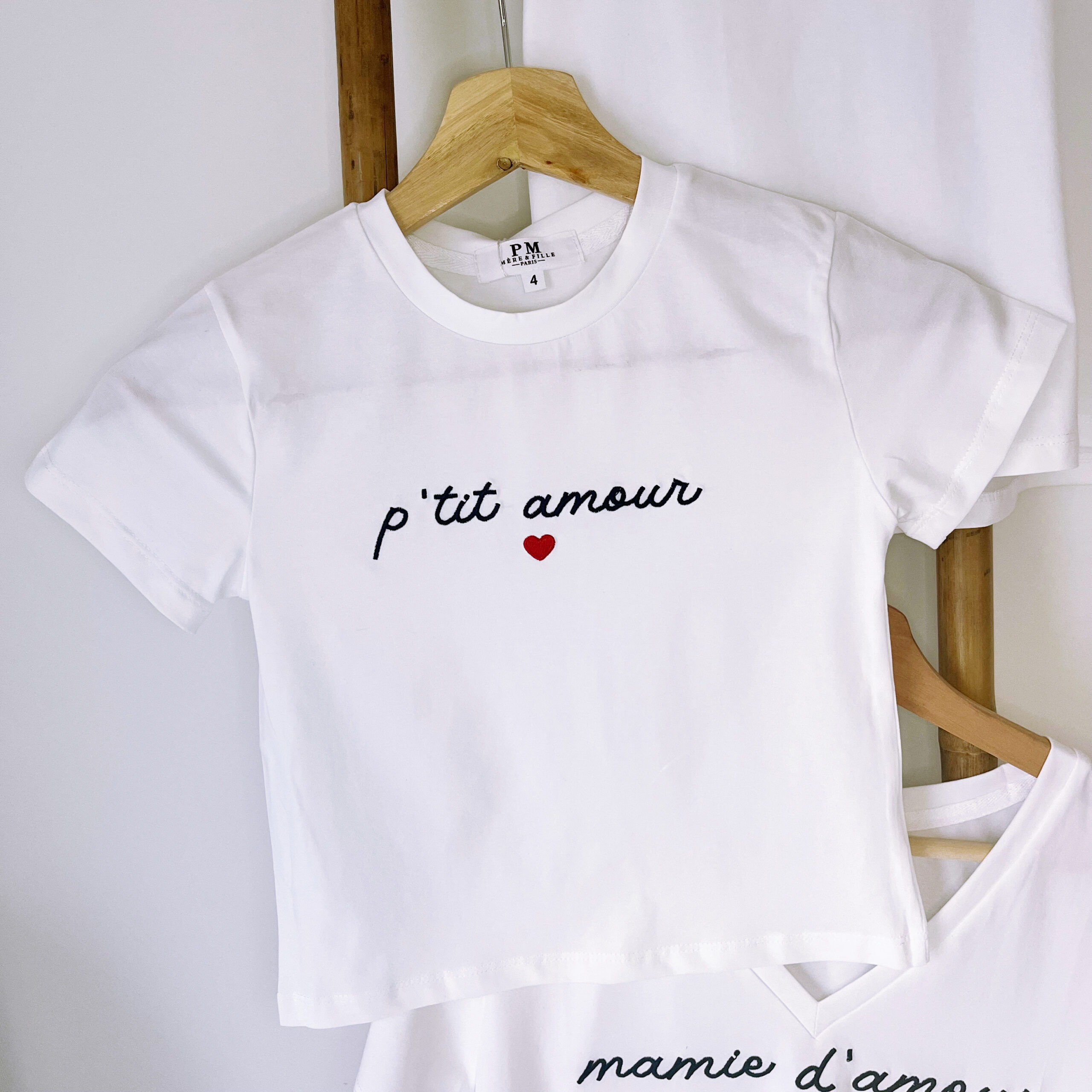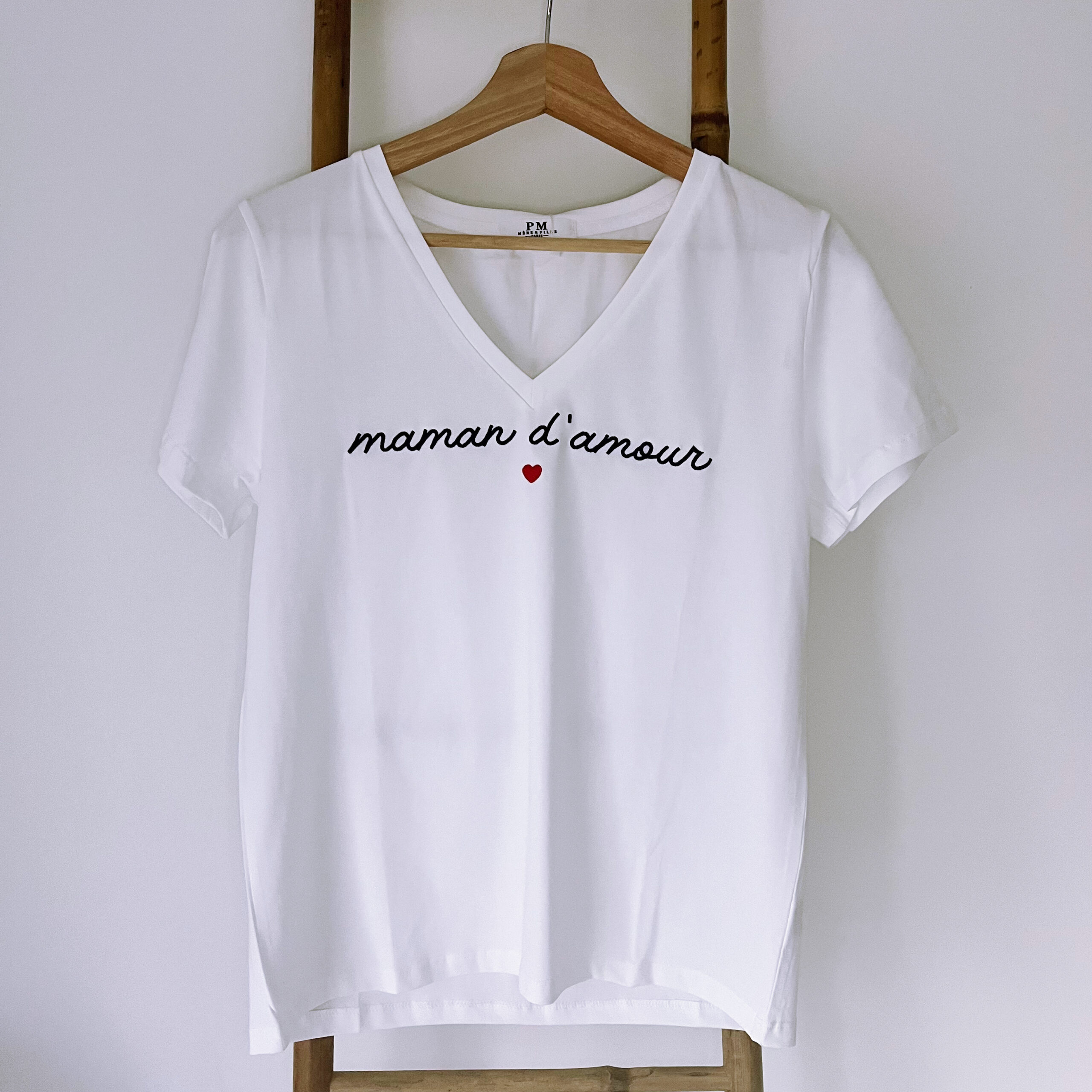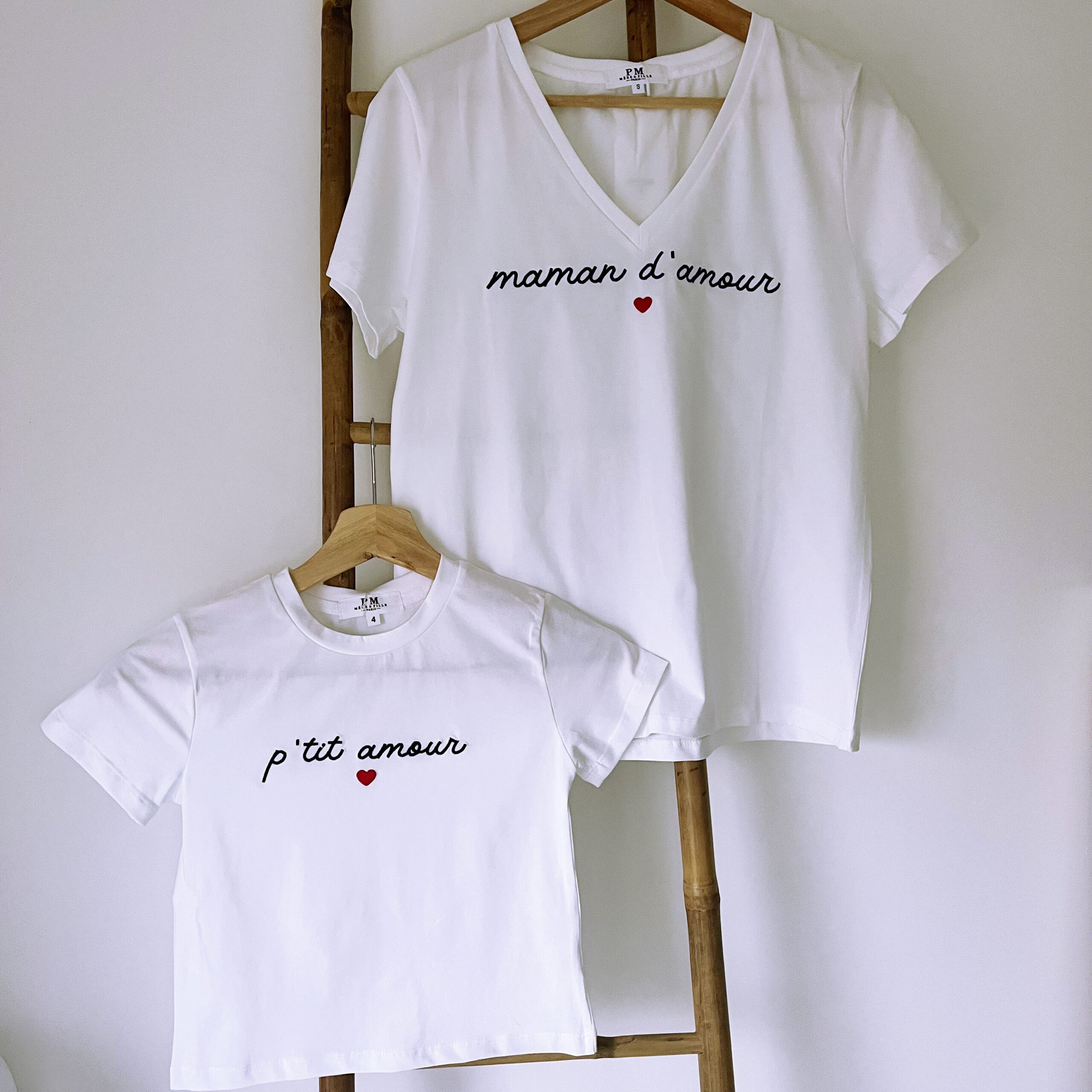 Exactement ce que vous recherchiez ! Un tee-shirt blanc avec des textes brodés. Maman ou Mamie et Enfant assorti, idéal pour se démarquer des autres quand on a une « mamie d’amour » et une « maman d’amour ».