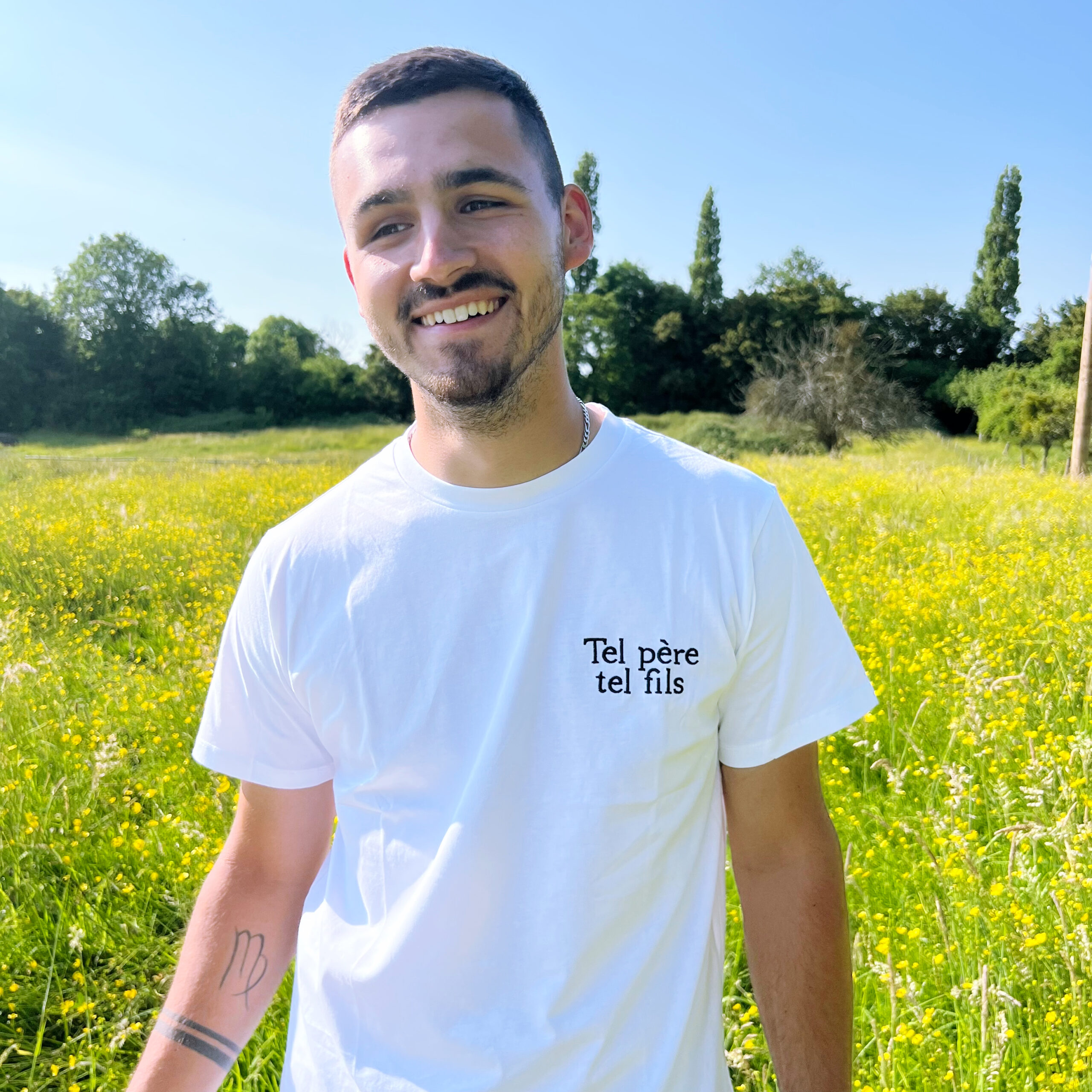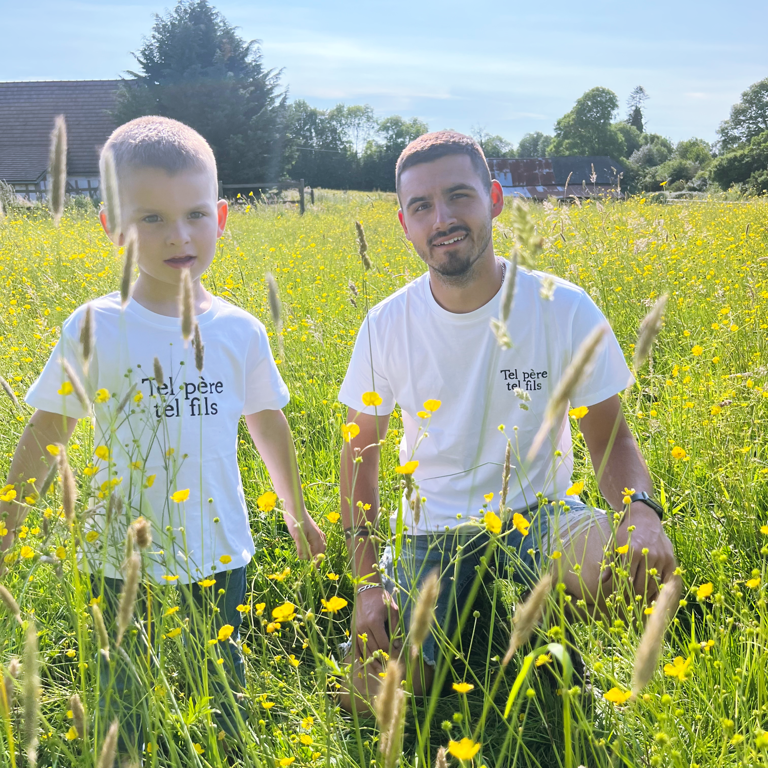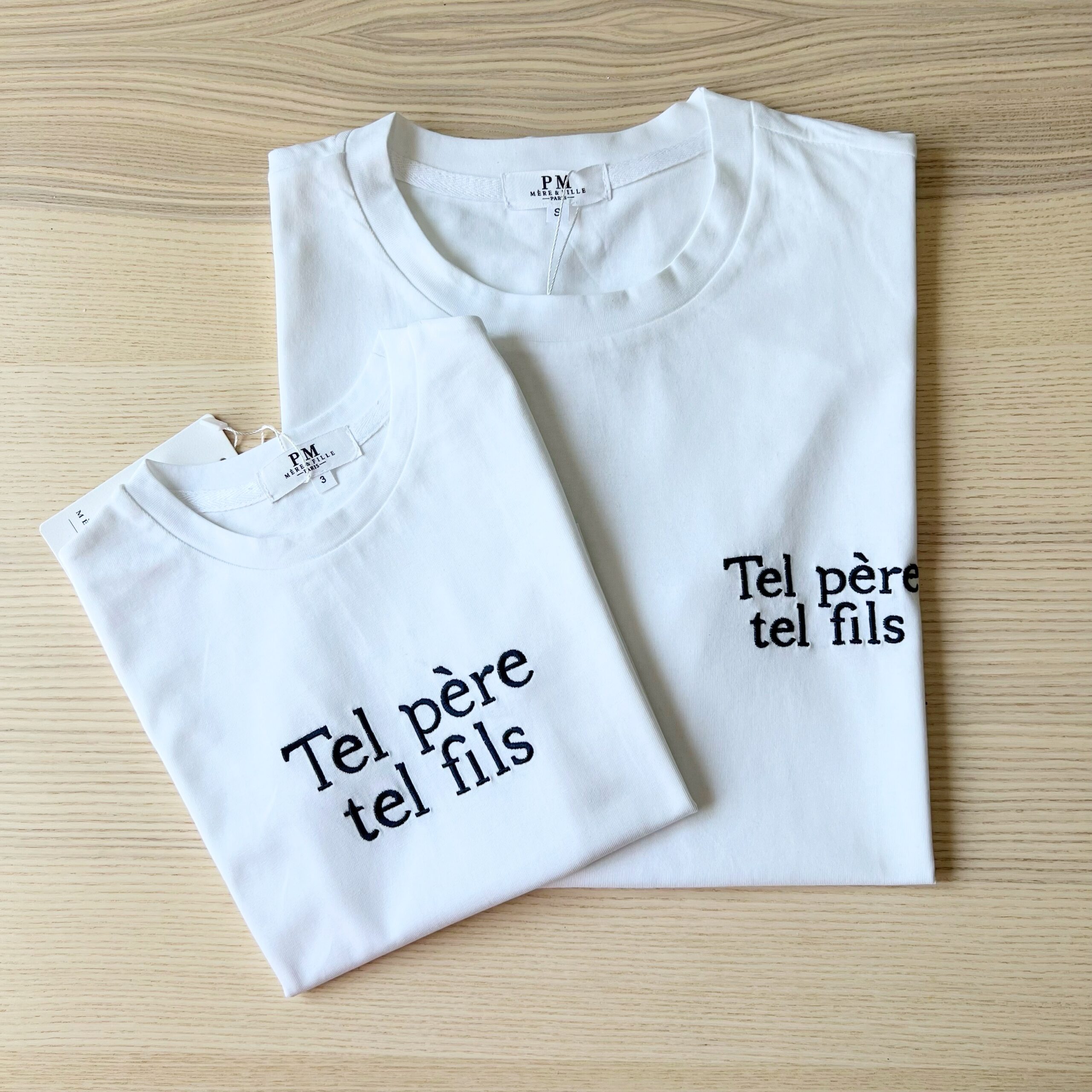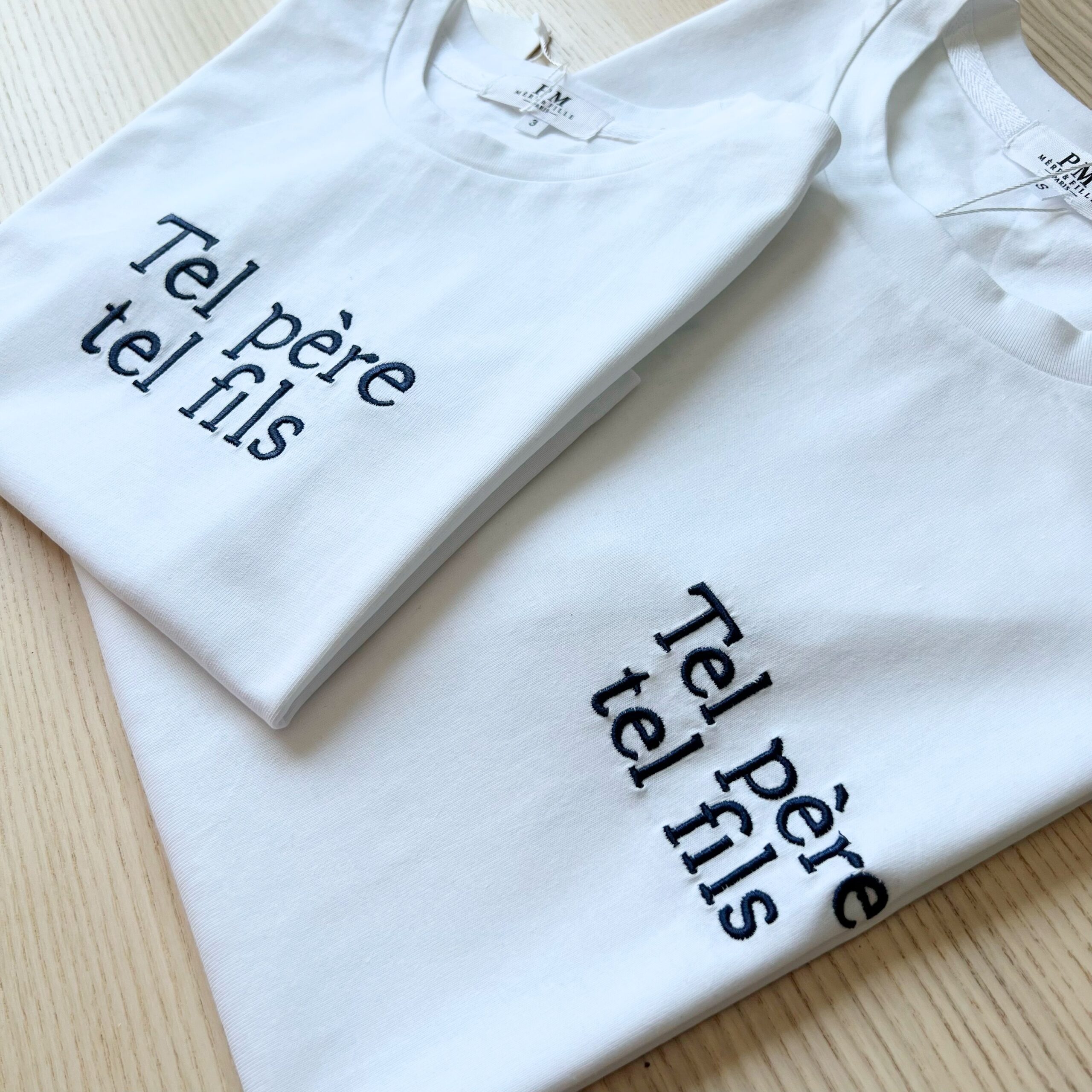 Tee-shirt col rond blanc avec écriture brodé « tel père tel fils » en bleu marine À partir de 3 ans jusqu’aux 10 ans pour les enfants, du S au XL pour les hommes. Prévoir sa taille habituelle, taille très bien. Composition : 100% coton.