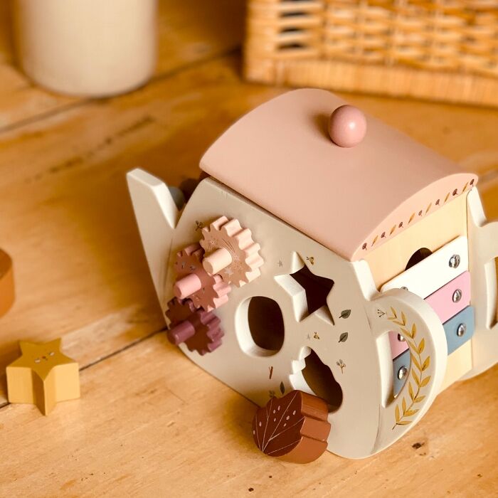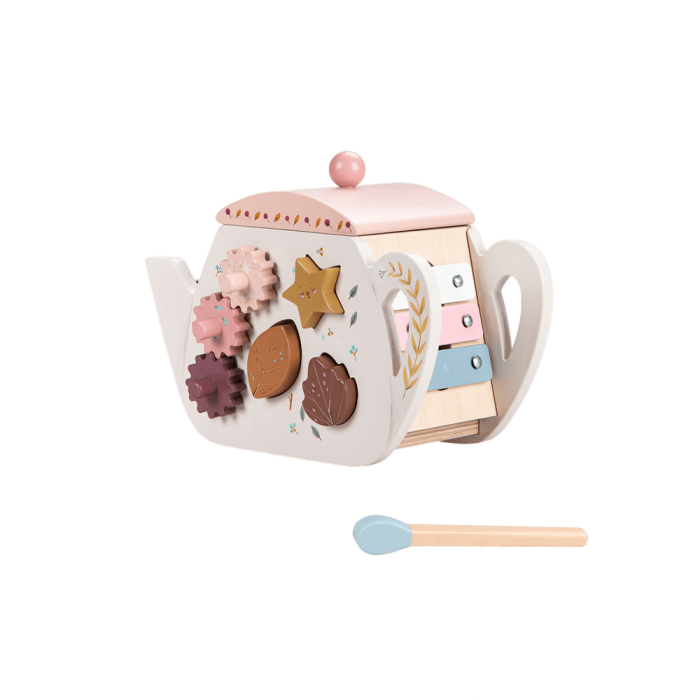 En voilà une jolie théière d’activités en bois pour bébé ! Chacune des 4 faces lui promet de jolies découvertes de jeux et d’apprentissages : boulier, formes à encastrer, roues dentées à faire tourner, xylophone…