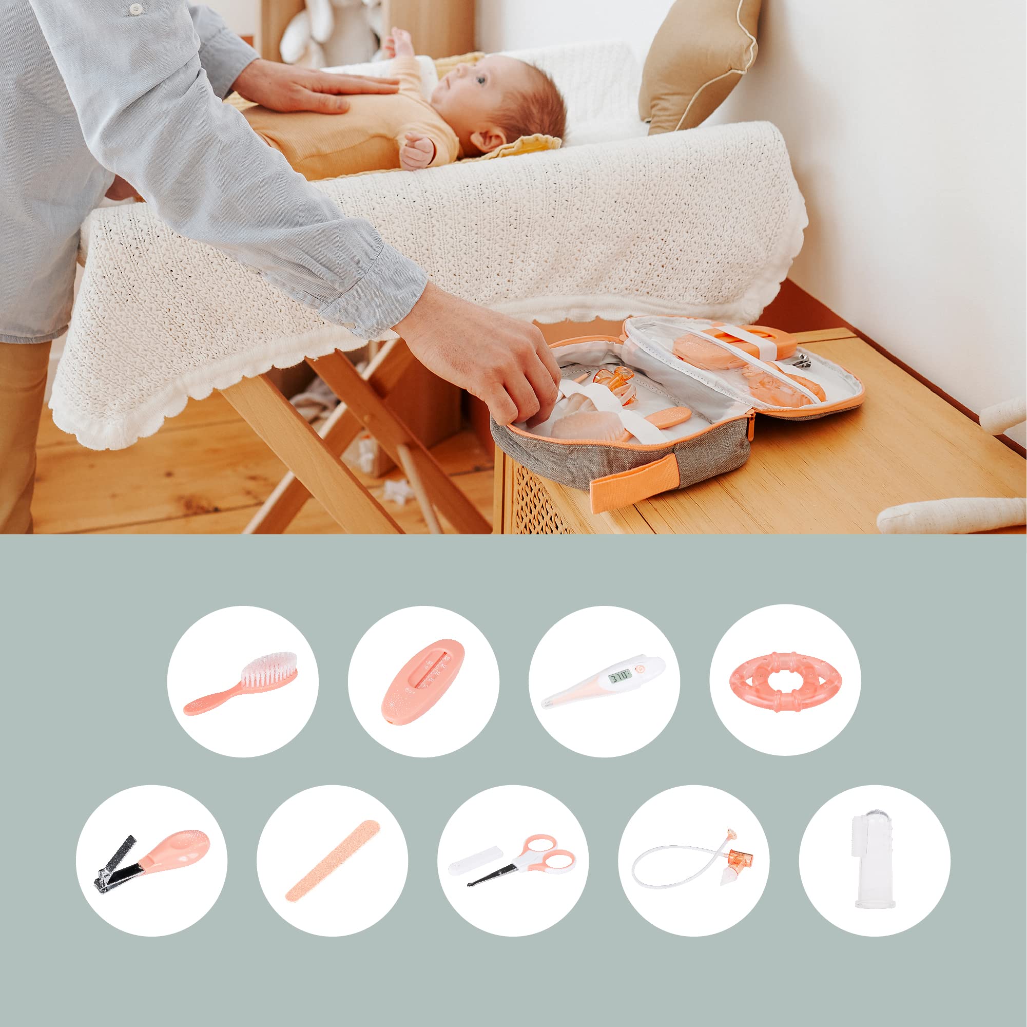 UNE TROUSSE DE SOIN COMPLETE : Contient les 9 accessoires indispensales pour le soin de votre bébé : 1 Thermomètre digital, 1 Mouche Bébé par aspiration buccale, 1 Paire de Ciseaux, 1 Coupe Ongle, 1 Lime, 1 Thermomètre de Bain, 1 Brosse à Cheveux, 1 Anneau de Dentition et 1 Masseur de Gencives DES LA NAISSANCE : Accessoires pensés pour une utilisation dès la naissance de votre bébé (ciseaux à bouts ronds, brosse à poils fins…) NOMBREUX RANGEMENTS: Possède des poches intérieures et extérieures zippées, filet ou élastiques – Multiples rangements libres, pour ajouter ce dont vous avez besoin (sérum…