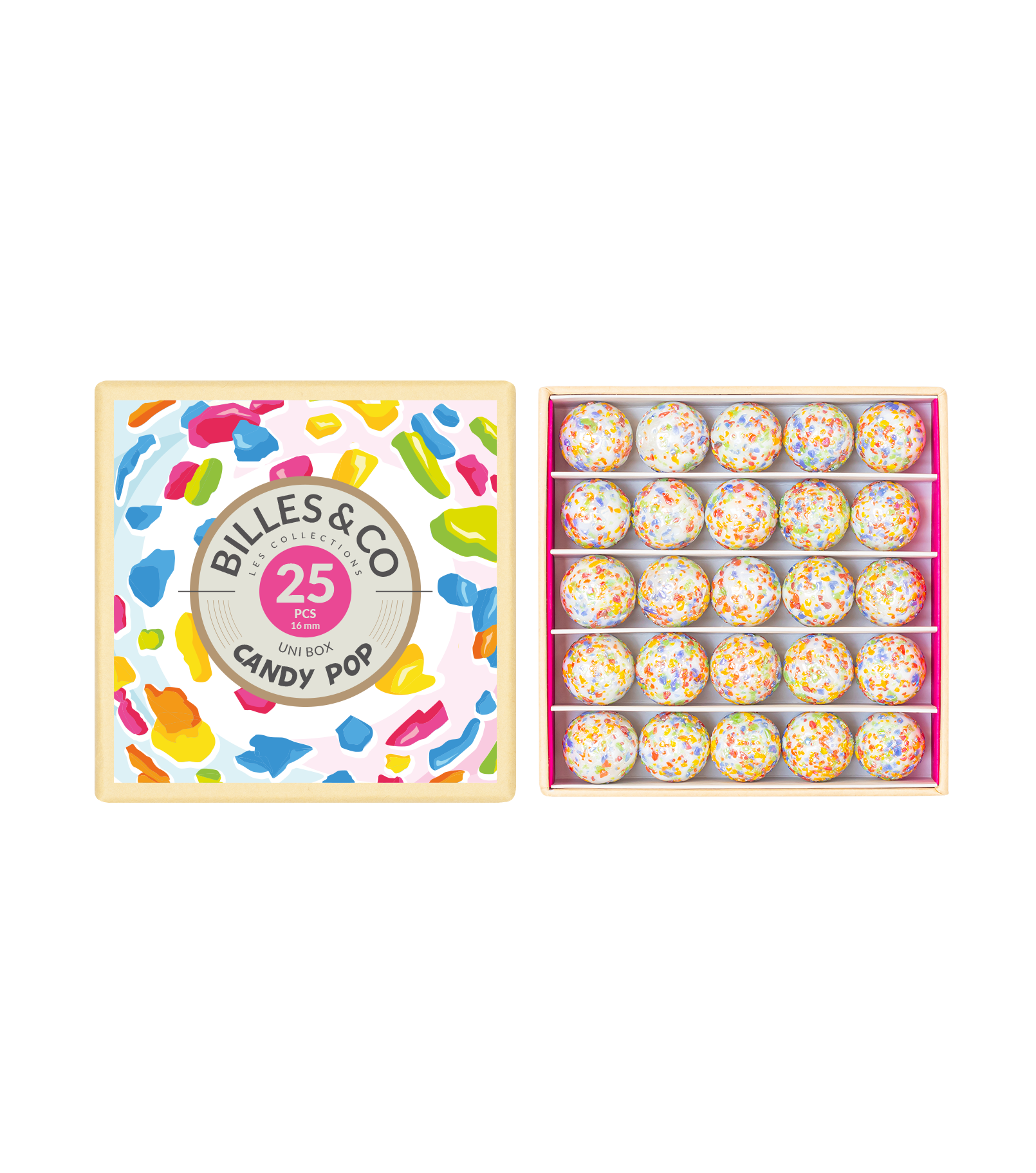 Coffret de 25 billes La bille Candy Pop, c’est un coup de glitter garanti ! Irisée, multicolore, joyeuse et si délicate à la fois, elle fait son entrée toute en lumière et sous les sunlights. Et si vous démarriez une collection ?