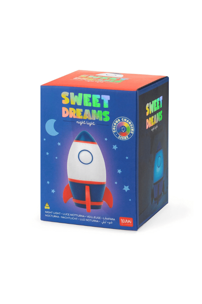 Découvrez la veilleuse Fusée de la marque Legami. Cette lampe idéale pour la chambre de votre enfant, sa lumière multicolore change progressivement, en adoptant 4 couleurs différentes pendant 20 heures d’autonomie.