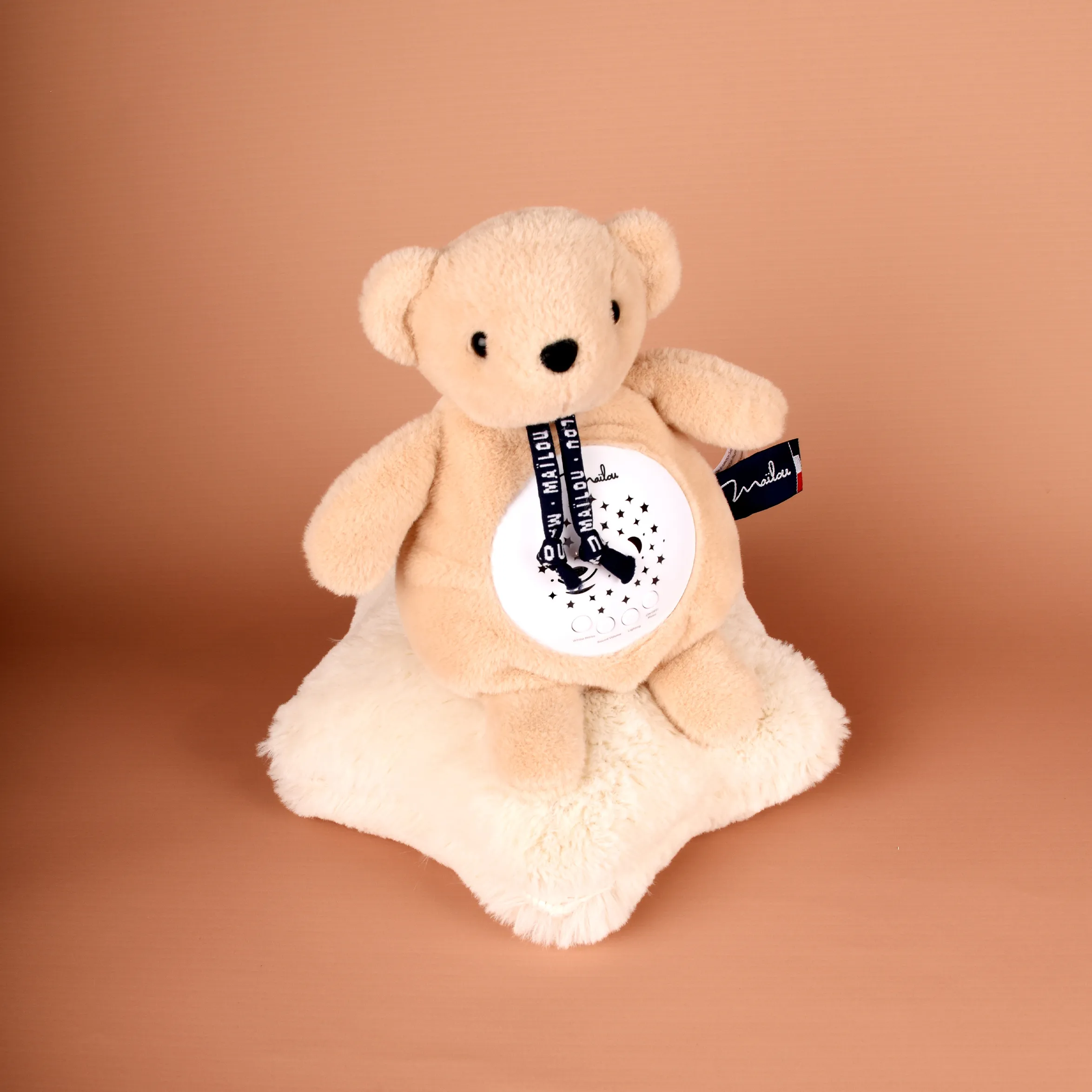 Veilleuse Musicale bébé Ours Dorlotin : peluche made in France avec projection lumineuse, 10 mélodies, 5 sons blancs et 7 couleurs. Lavable et toute douce.