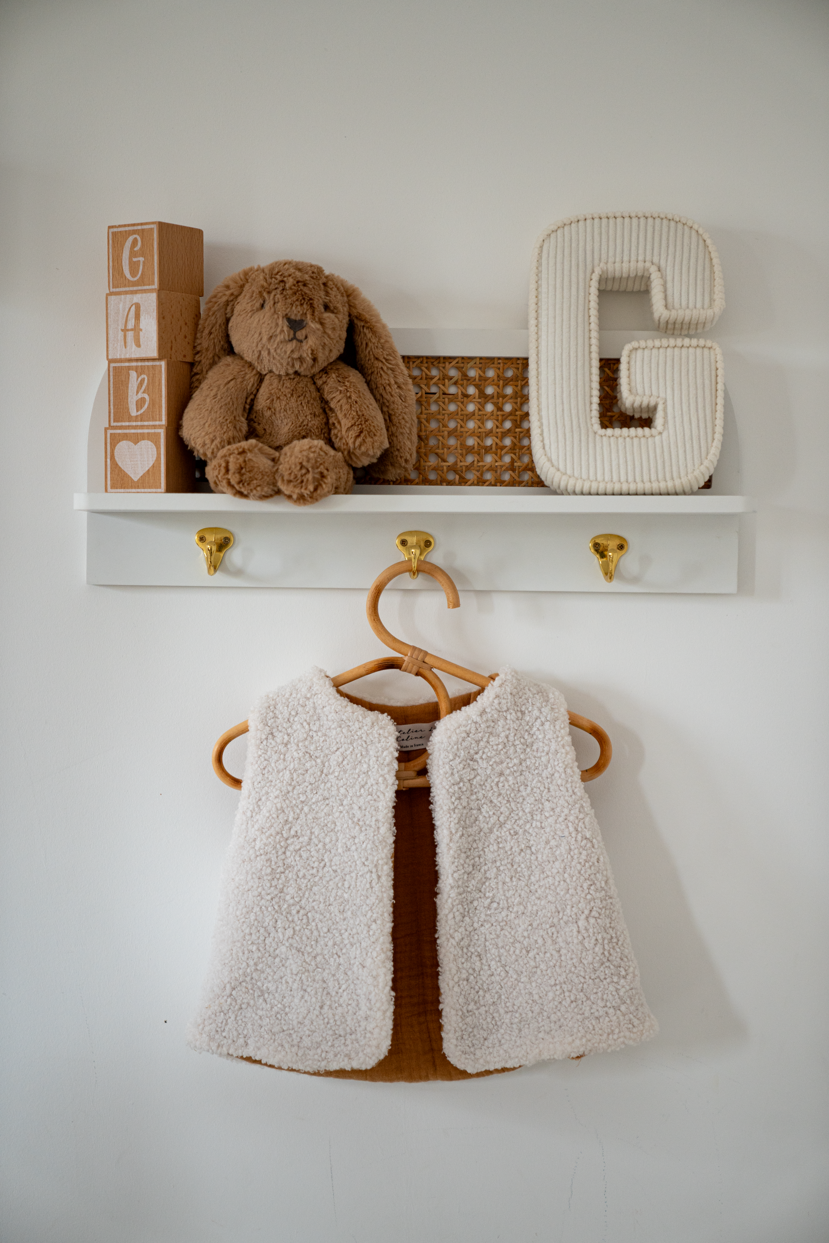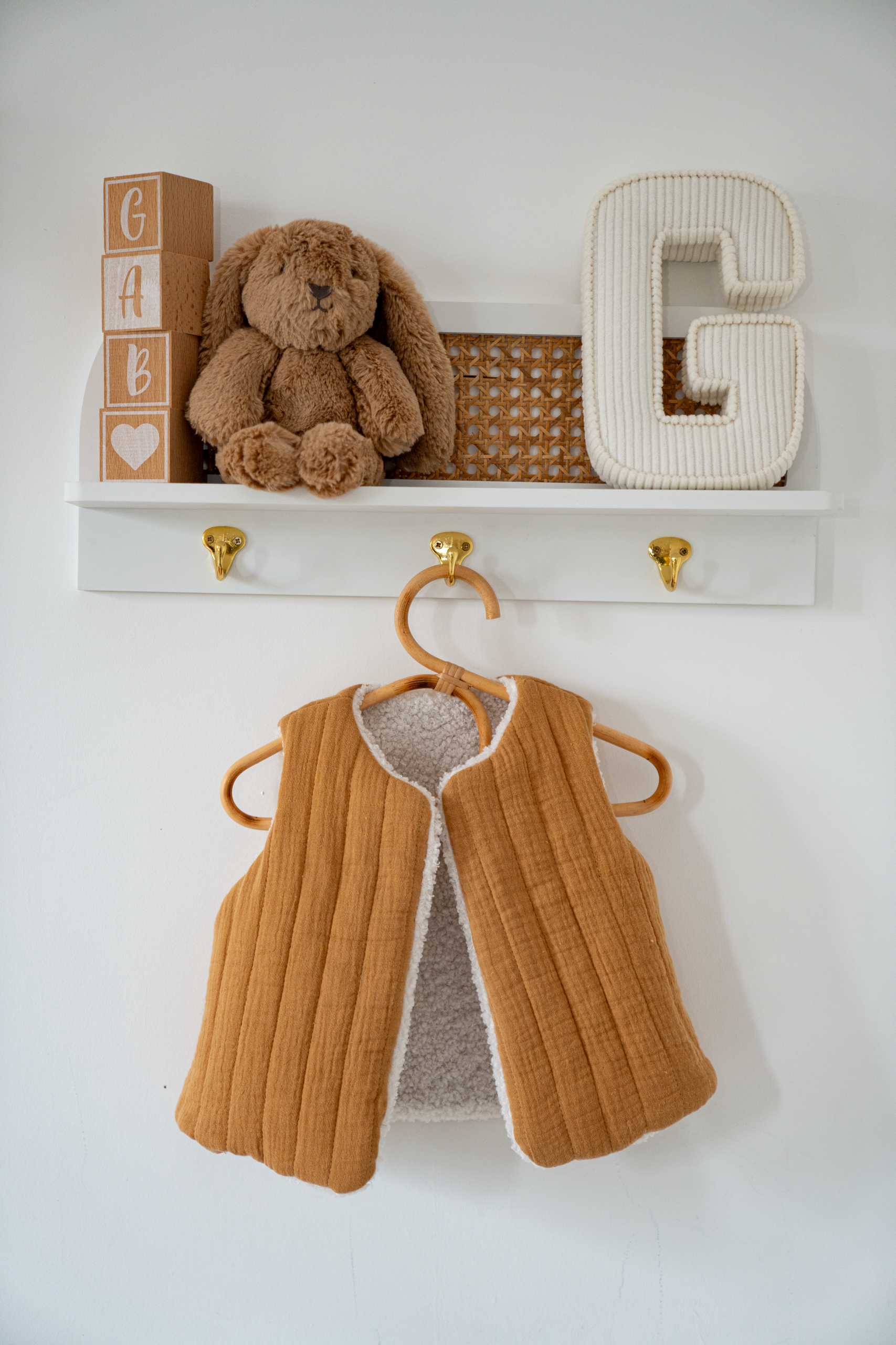 Veste sans manche unisexe, en tissus matelassé double gaze Disponible en deux versions : la version réversible sans pression et la version avec pression Disponible a partir de la naissance jusqu’a 7 ans Lavage en programme délicat, pas de sèche linge Délai entre 2/3 semaines Tissus moumoute – double gaz matelassé camel